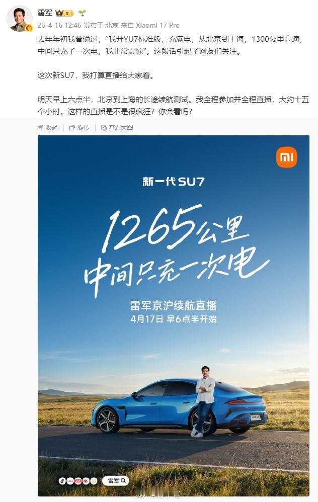 雷总明天要开新SU7 从北京到上海,全程直播。