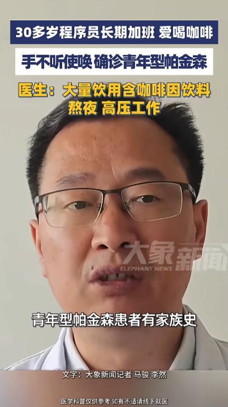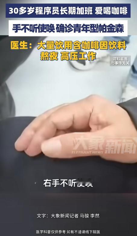 “万万没想到!”近日,河南郑州,一男子突然出现手抖的情况,写字也越来越小,他开始以为自己是颈椎出了问题,后来又怀疑是得了焦虑症,可治了几个月都不见好转,最后竟然给确诊为青年型帕金森病,网友:这不是老人病么? 这个男子的日常,正是当下无数年轻人的真实写照,忙碌到连喘息的间隙都没有。 高强度的工作让他常年处于疲惫状态,撑不下去的时候,他唯一的“救命稻草”就是高咖啡因饮料,硬撑着把工作做完。 他不是没有意识到这种生活方式在伤害自己,可看着堆积如山的工作,看着身边人都在拼命努力,他根本不敢停下脚步。 最先出现的症状就是手抖,当时他没太在意,只当是长期久坐、对着电脑,颈椎出了问题。 现在很多上班族都有颈椎困扰,久坐不动、低头看屏幕,颈椎不舒服、引发手部发麻发抖。 为了改善颈椎问题,他特意买了颈椎按摩仪,每天下班回家第一件事就是按摩颈椎,还跟着网上的教程做拉伸。 甚至专门去理疗店做了好几次颈椎理疗,可无论他怎么调理,手抖的情况不仅没有好转,反而越来越明显。 更让他在意的是,自己写字变得越来越奇怪,以前他的字虽然不算精致,但至少工整易认,可慢慢的,字越写越紧凑、越写越小。 有时候写完一行字,自己都要凑近了才能看清,就连日常签名字,都变得格外费力,手部控制不住地发飘,连笔画都写不连贯。 而且颈椎调理了许久,一点效果都没有,所以他觉得多半不是颈椎的问题。 他开始反复琢磨,是不是自己最近压力太大,患上了焦虑症。 长期熬夜加班,精神一直处于高度紧绷的状态,有时候忙到极致会忍不住崩溃,夜里也常常失眠,偶尔还会莫名烦躁、情绪低落,他觉得这些状态都和焦虑症很像。 带着这份猜测,他去看了心理医生,把自己的工作压力、生活状态和身体上的异常,一五一十地告诉了医生。 之后他也试着按照医生的建议去做,可工作的压力容不得他松懈,有时候还是要熬到深夜,药物也按时服用,可一晃几个月过去,手抖的症状不仅没有改善,反而愈发严重。 后来,他手抖的情况已经严重影响到正常生活,吃饭时端碗都会抖得厉害,夹菜都费劲,写字更是困难,有时候写着写着,手部就会变得僵硬,连笔都握不住,得缓好一会儿才能继续。 在身边人的劝说下,他再次去了医院。 当医生拿着检查报告,告诉他确诊为青年型帕金森病时,他整个人都僵住了,愣了好久才反应过来,反复向医生确认。 医生耐心地给他解释,帕金森病确实在中老年人中更为常见,但它并不是老年人的“专属病”,现在越来越多的年轻人也会患上这种病。 而他的发病,和长期熬夜、过度劳累,以及大量摄入高咖啡因饮料有着直接的关联。 高咖啡因饮料确实能提神醒脑、缓解疲劳,可实际上,它只是暂时掩盖了身体的疲惫,并没有真正解决疲劳问题。 再加上熬夜时常常伴随的久坐、饮食不规律,会进一步削弱神经系统的抵抗力,慢慢侵蚀年轻人的神经系统。 这个案例被分享到网络上后,很快就引发了全网热议,评论区里满是网友的震惊。 很多网友留言表示:“自己也是天天加班、靠咖啡或功能性饮料续命,看到这个新闻后,赶紧下意识地摸了摸自己的手,心里满是后怕。” 还有网友说到:“一直以为帕金森病离自己很遥远,从来没想过会发生在同龄人身上,以后再也不敢长期熬夜、过量喝高咖啡因饮料了。” (信息来源:大象新闻《30多岁程序员长期加班、爱喝咖啡,右手不听使唤确诊青年型帕金森》)