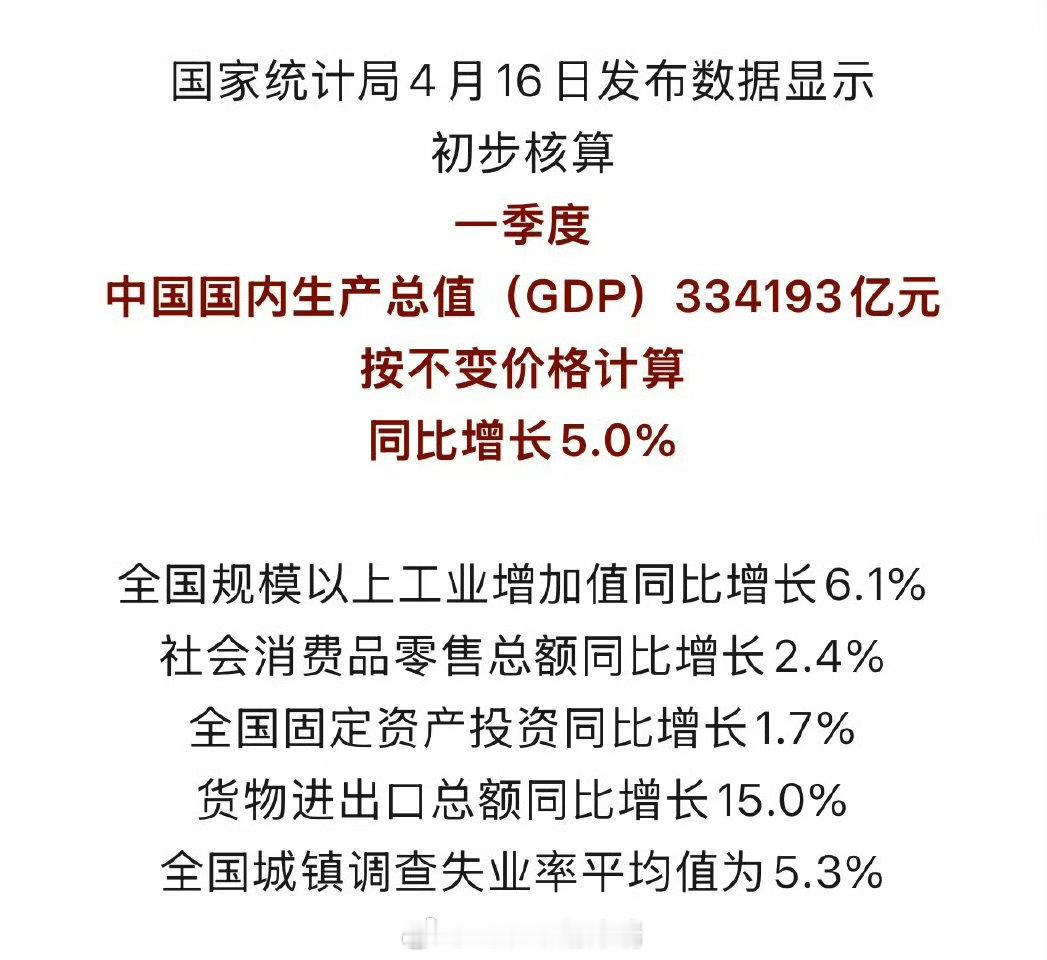 2026年一季度GDP同比增长5.0%国家统计局今日发布:一季度GDP334193亿元,同比+5.0%,环比+1.3%,较上年四季度回升0.5个百分点。分产业:一产3.8%、二产4.9%、三产5.2%。工业、外贸、消费同步改善,新质生产力提速,经济良好开局、韧性彰显。