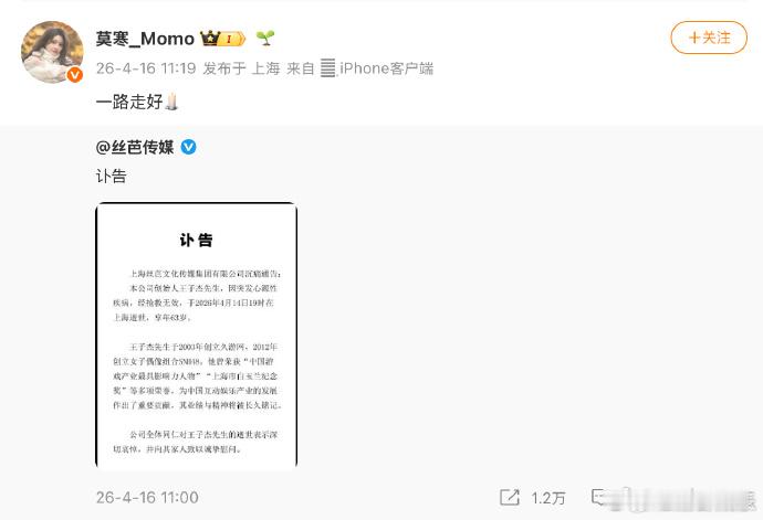 众星悼念王子杰前SNH48成员悼念王子杰 前SNH48成员转发讣告,悼念丝芭总裁王子杰。↓