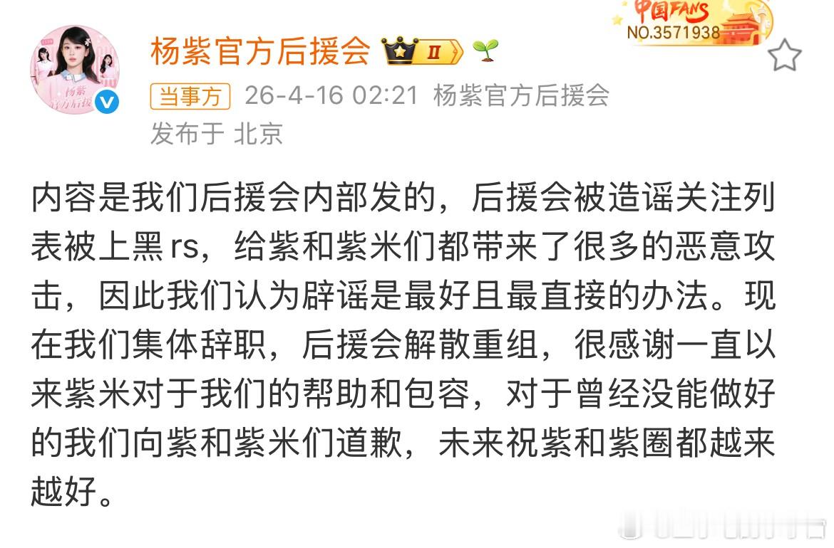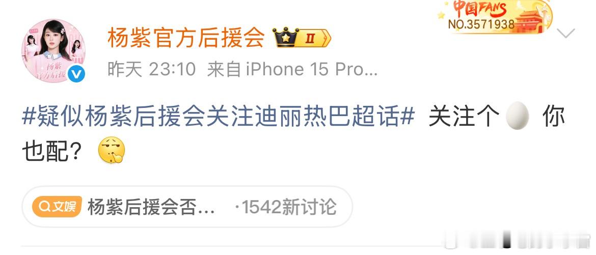 杨紫官方后援会回应粉丝关注迪丽热巴一事,竟被网友嘲讽“你也配”,随后集体辞职。是觉得内部不够乱吗?辞职还要添乱,建议工作室直接接管后援会,粉丝可参与管理,但具体事务还得由团队负责。问题出现时应迅速处理,而不是让粉丝打着官方旗号情绪化发言,反而给杨紫带来负面影响。