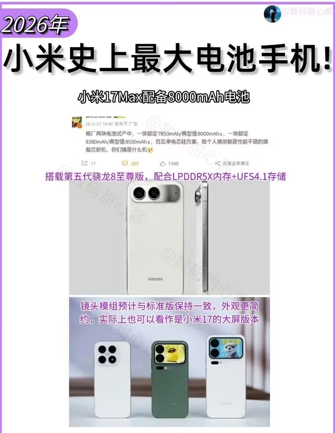 小米 17 Max太懂续航党了,直接砍掉背屏堆8000mAh电池,对我这种天天带充电宝的人太友好了小米史上最大电池手机曝光