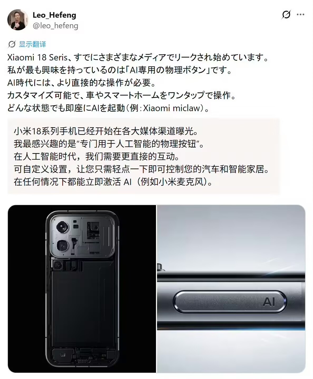 小米这几款未发布的新机爆料还挺有看点的,大电池和独立AI按键的设计都很实用,也挺贴合“人-车-家”一体生态的小米18Pro新增AI按键
