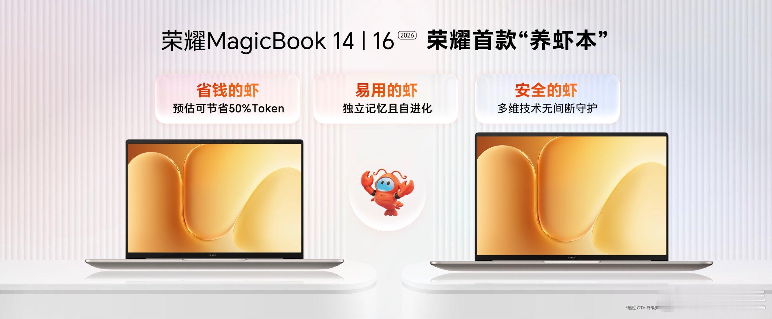 可以养🦐的笔记本来了!4月16日,荣耀史上最短发布会带来超满分笔记本!荣耀MagicBook 14 | 16 2026款新品搭载第三代英特尔酷睿Ultra处理器,超强核显轻松流畅运行;全系标配92Wh大电池,15.6小时最长续航彻底告别电量焦虑,没有标准杯,全都大满贯,都是超大杯! 真正做到了最短发布会,最长的续航。荣耀MagicBook数字系列更是荣耀首款养虾本,一键养虾,安全更省钱。产品放心、价格放心,真正做到了让用户放心选,荣耀MagicBook 14 | 16 2026款首销价5949.15元起,现已全渠道开售!怎么样?想养虾的朋友可以关注下。