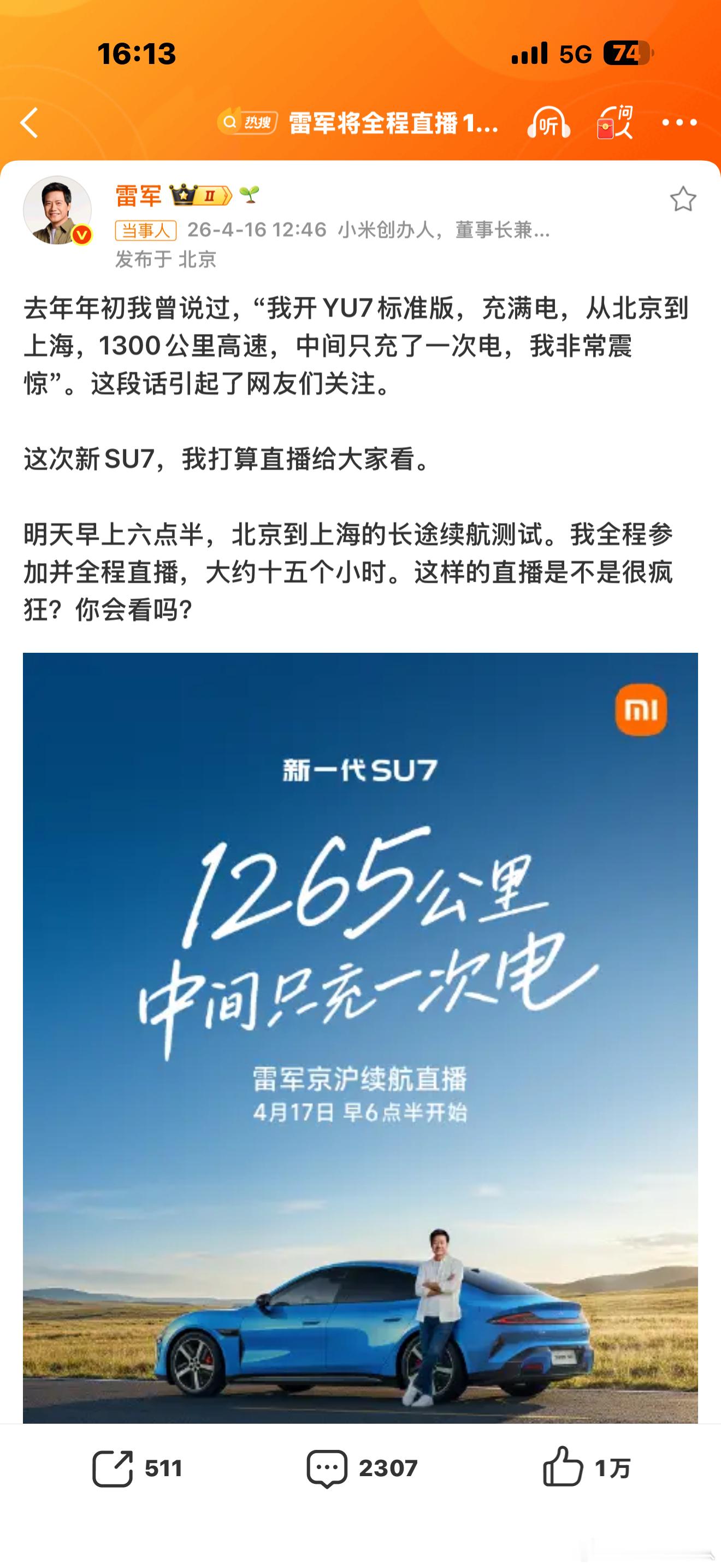 雷军将全程直播15小时光开车15小时已经很累了你再加上直播得一直说。不管雷总看着多年轻,其实也上年纪了。所以车企领导也不好干~原来只是费脑,现在还是体力好