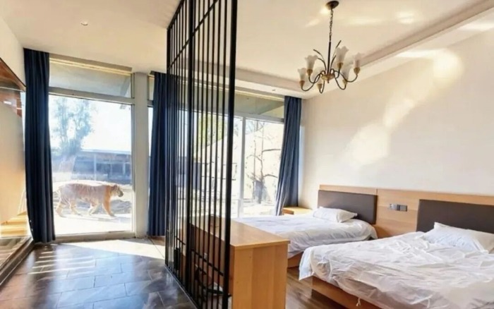 #河南一动物园推出三层玻璃虎景房#【#动物园虎景房五一预订近饱和#】近日,河南焦作沁阳市和生森林动物乐园因推出可近距离观赏老虎的落地窗式“虎景房”引发社会关注。4月16日,大皖新闻记者从和生森林动物乐园获悉,“五一”假期期间,该动物乐园推出的30多间“狮虎主题”特色客房预订紧俏。“五一期间的房间已经订了七七八八了。”动物乐园工作人员说道。