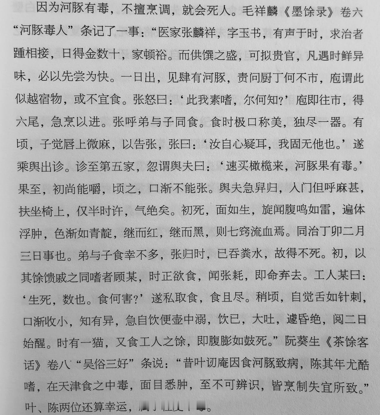 分享一个吃河豚中毒的故事,来自毛祥麟《墨馀录》。文言文功功底好的,可以直接看原文。 有个叫张麟祥的医生,医术有名,天天病人排着队找他看病。他因此赚了不少钱,家里日子过得很阔气,吃得比当官的还好,而且特别喜欢抢鲜吃各种时令美味。 有一天他出门,看见街上有卖河豚的,回头就责怪厨子:“你怎么不去买?”厨子说:“那鱼看着像隔夜的,怕吃了出事。”张医生一听就火了:“我就好这口,你懂什么?”厨子只好去买了几条,赶紧做了端上来。 张医生喊来弟弟和儿子一块吃,一边吃一边夸,自己就干掉了一整盘。没过一会儿,儿子觉得嘴唇有点麻,跟他说。张医生还不信:“你自己心里瞎想,我啥事没有。”说完就坐着轿子出诊去了。 等他看到第五个病人的时候,忽然跟抬轿子的说:“快去给我买点橄榄来,这河豚还真有毒。”橄榄买来了,刚开始还能嚼,没多久嘴巴就张不开了。轿夫赶紧把他抬回家,一进门他就喊“麻死了”,刚在椅子上坐下,也就半个时辰,人就没了。 刚死的时候,脸看着还正常,接着就听到肚子里像打雷一样响,全身肿起来,颜色从青变红,再变黑,最后七窍流血。这是同治丁卯年(1867年)农历二月三号的事。 他弟弟和儿子吃得少,发现不对时已经吞了粪水催吐,这才捡回一条命。 再说张医生家有个亲戚顾某,也好这口。张医生出事前,把自己没吃完的河豚送了他一些。顾某刚准备吃,就听说张医生死了,赶紧叫人扔掉。 可他家的一个工人说:“生死有命,怕什么?”偷偷把鱼拿过来吃了,基本上吃得干干净净。 没一会儿,他就觉得舌头像针扎一样,嘴也慢慢张不开了。知道不对,赶紧喝了自己尿壶里的尿,喝完又吐得昏了过去。过了两天才醒过来。 还有个彩蛋: 当时有只猫,吃了这个工人剩下的鱼渣,结果肚子胀得像鼓一样,死了。 ———— 现在吃到的的河豚🐡,都是工厂化养殖的。在大饭店吃河豚,再也不用担心中毒的问题,而且一年四季都能吃到河豚🐡。
