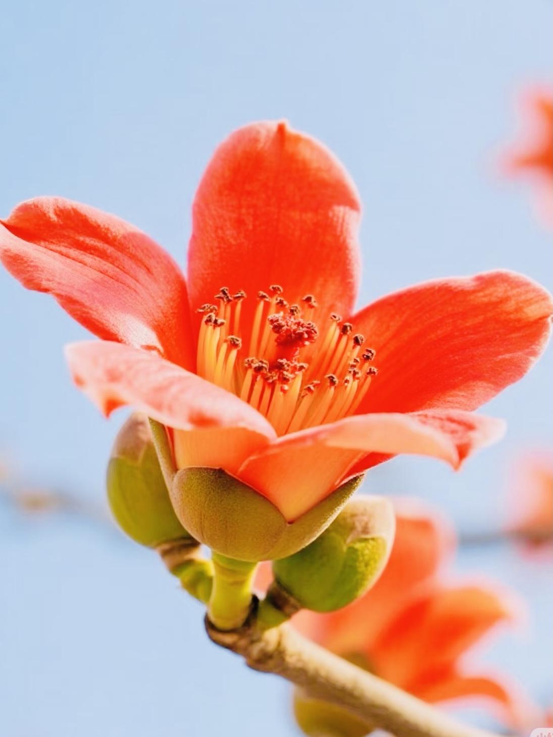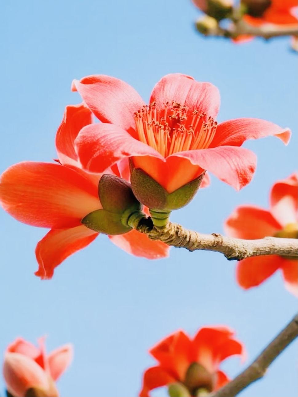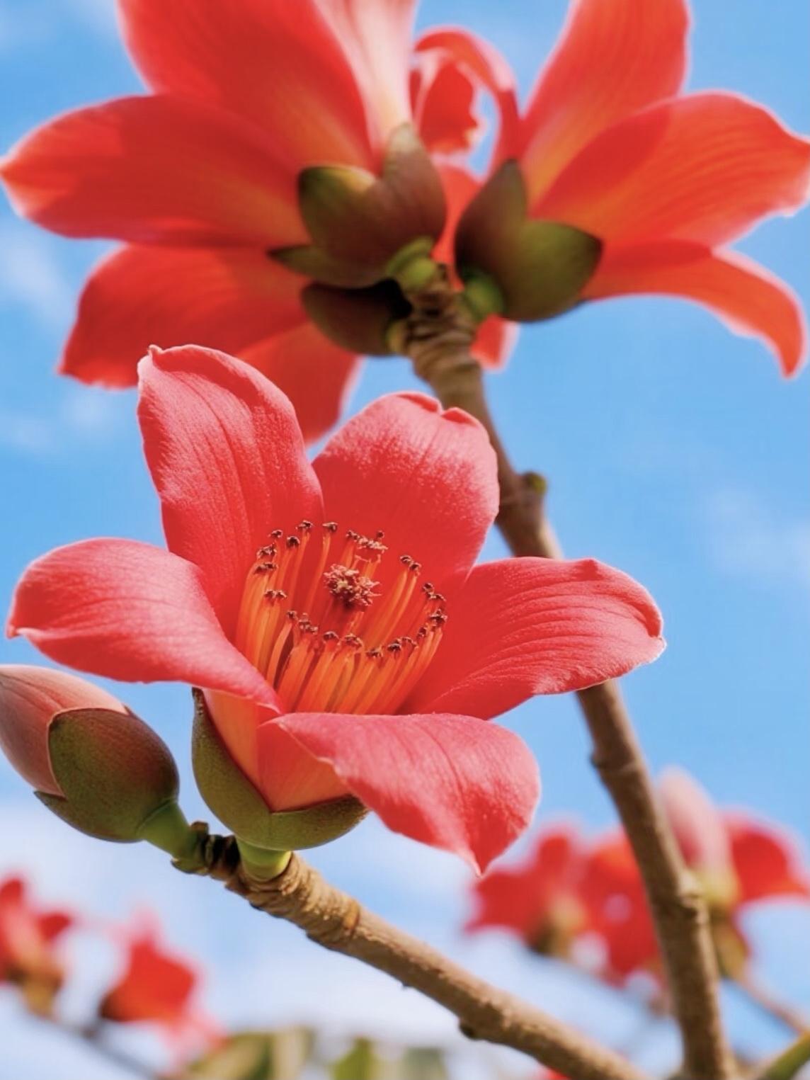 木棉花盛开的时节, 春风轻拂,花朵娇艳迷人, 一朵朵木棉花像燃烧的火焰, 在枝头肆意绽放。 木棉花那热烈的红,美得不可方物,