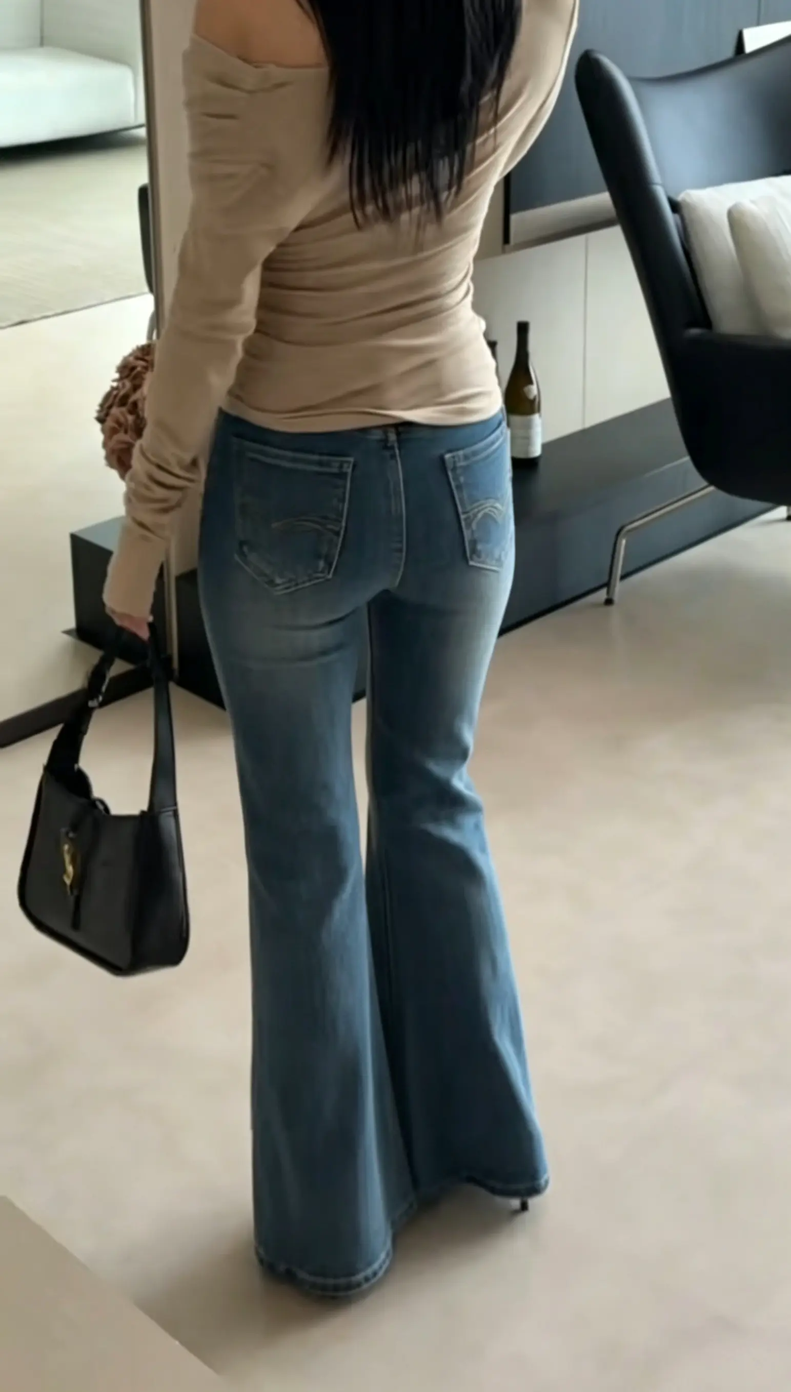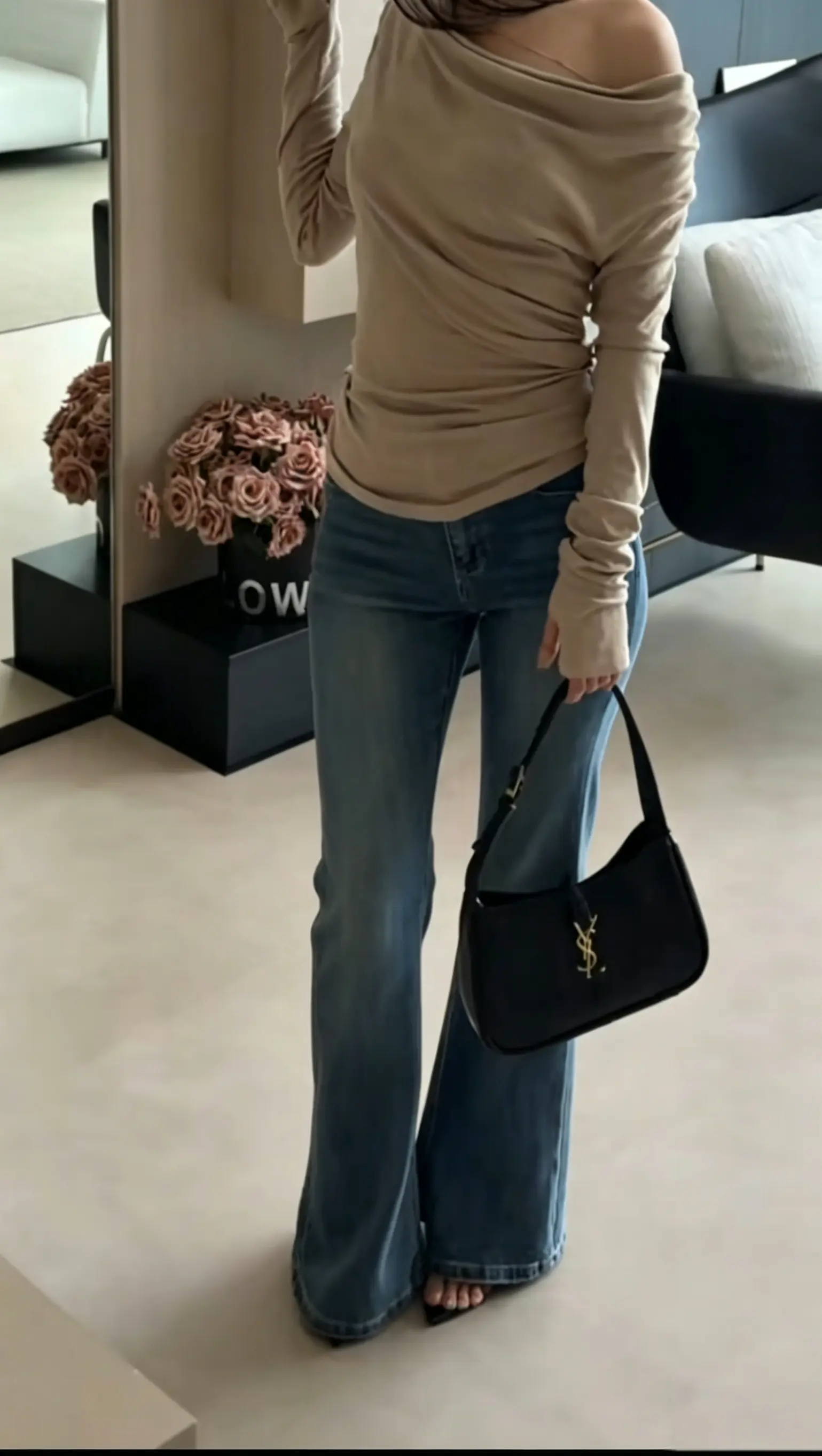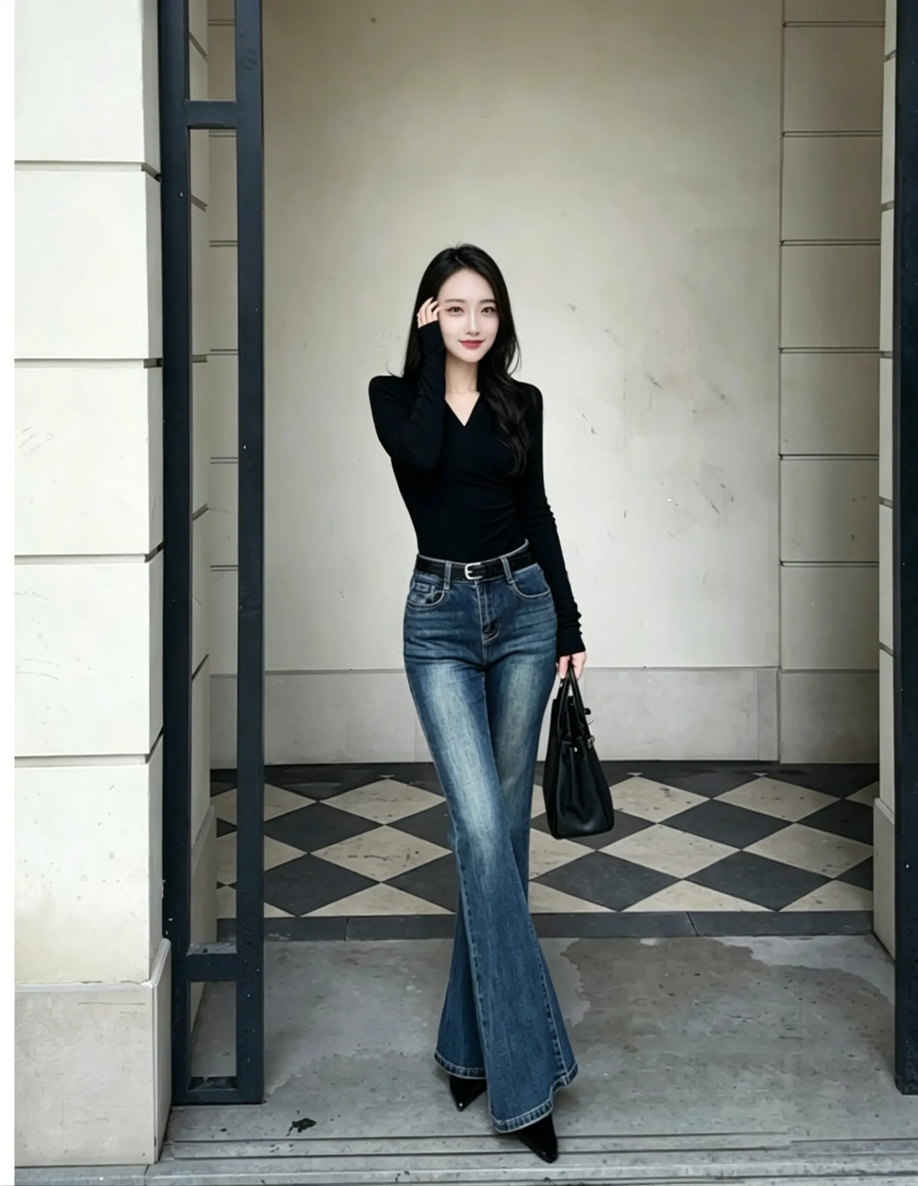 紧身牛仔裤牛仔裤穿搭牛仔裤露肩上衣显瘦穿搭弹力紧身喇叭牛仔裤