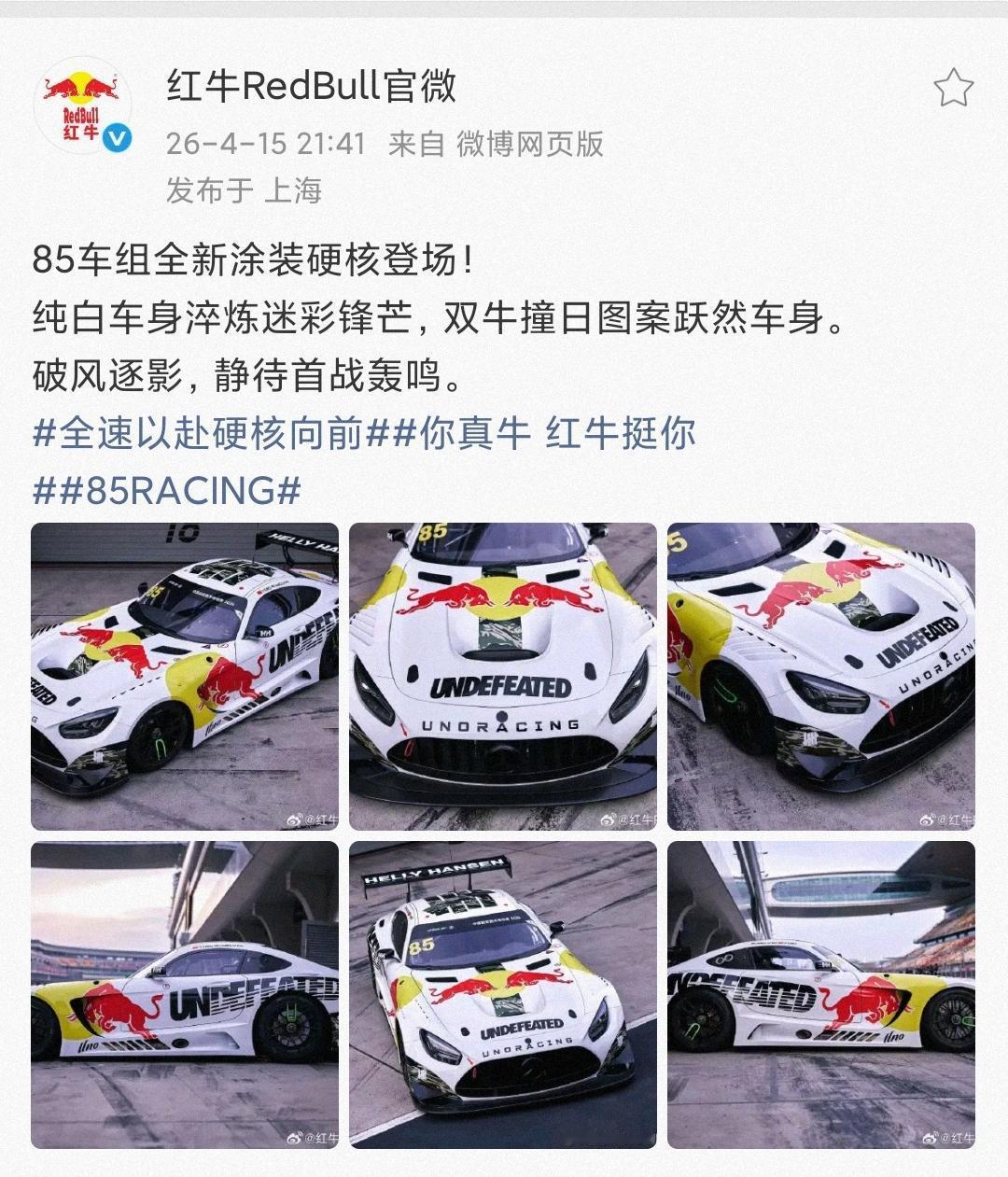 王一博85车组全新涂装硬核登场!酷😎! 终于登上大C位的红牛可是激动了起来[笑哭]。 “纯白车身淬炼迷彩锋芒,双牛撞日图案跃然车身。” 经典红牛标志加纯白车身,HH和五道杠加持守护,85号这寸土寸金的黄金广告位,没有实力你可真挤不进来[大金牙]。 王一博 85racing