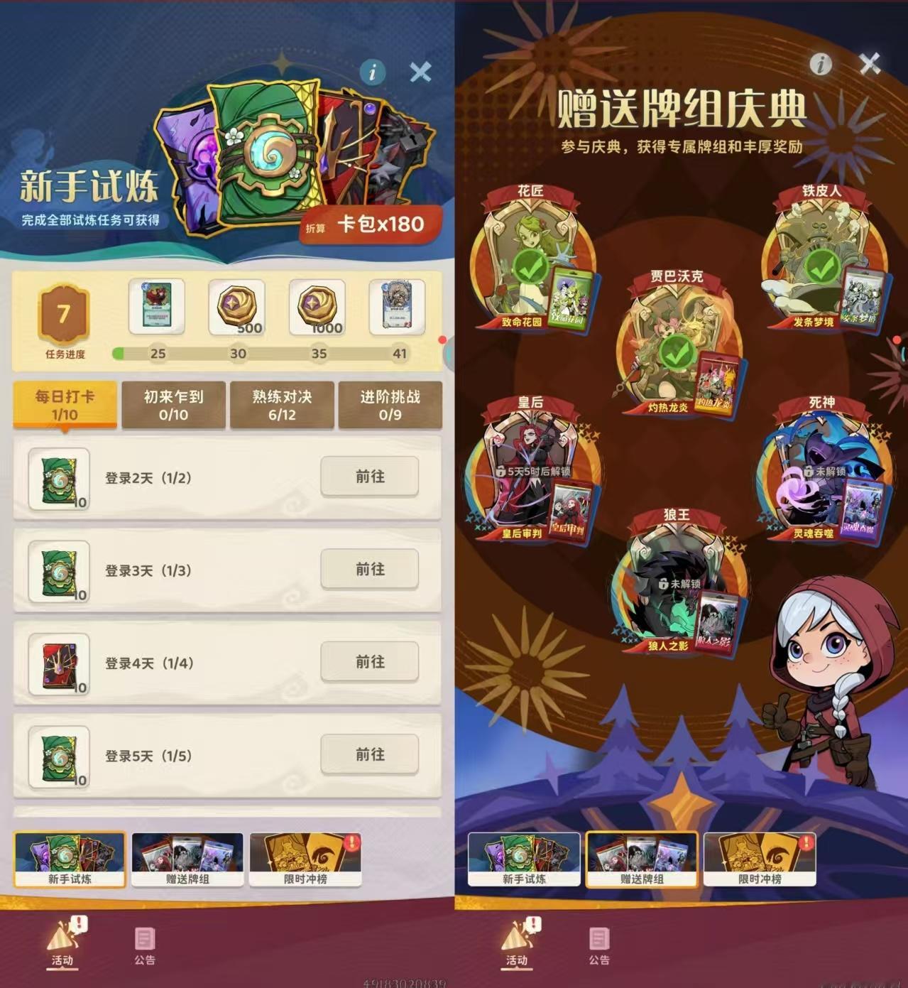 炉石传说 2026年了,竟然还有人敢做新卡牌游戏?月圆之夜今天推出了“CCG 构筑对战模式” ,新手送180包+免费领6套牌,主打三分钟一局,玩了一下节奏确实快,因为开局2费,随从上场就冲锋,而且体系联动多,变0费、buff提战力非常快,非常适合摸鱼。此外,英雄二阶觉醒、转职、墓地、反制这些机制还蛮有意思,感兴趣可以试试。