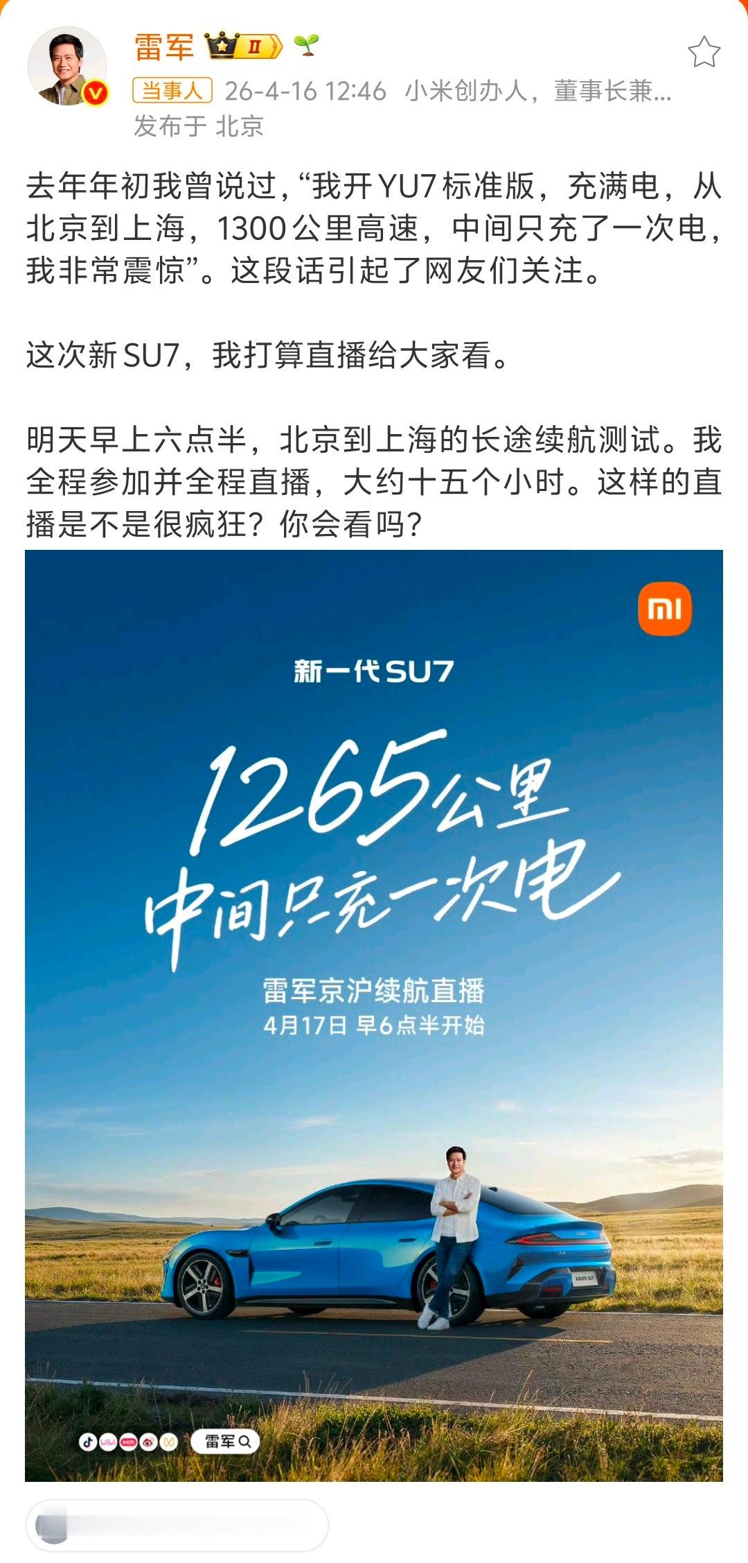北京到上海的长途续航测试,全程约15个小时,雷军全程参加并全程直播