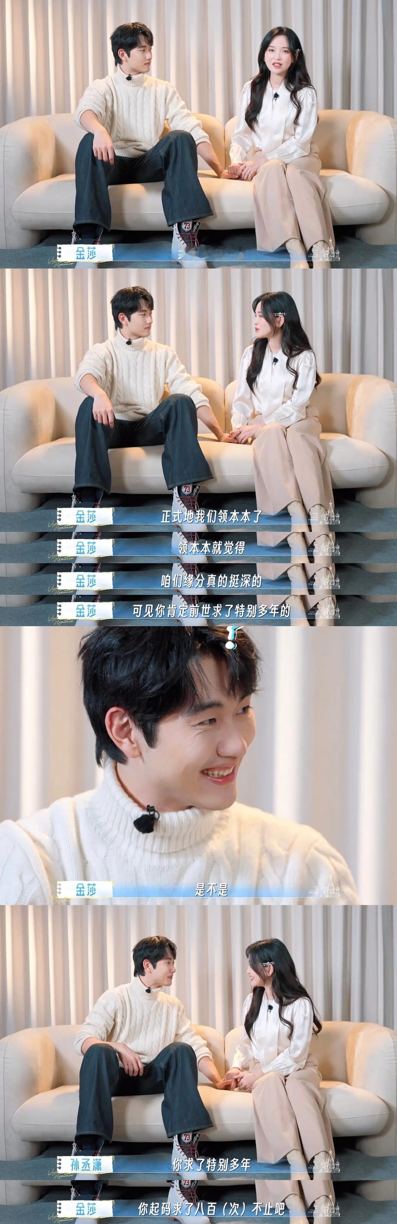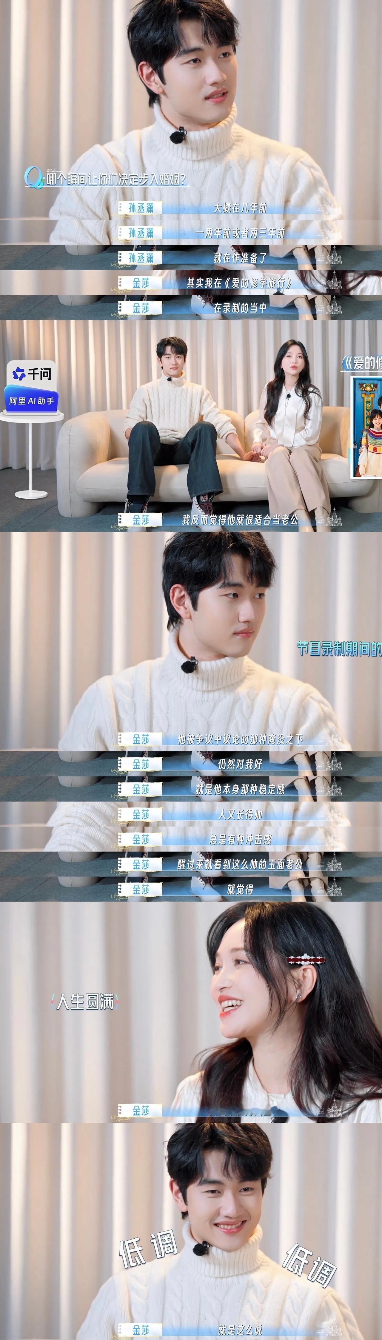 金莎孙丞潇上《妻子的浪漫旅行》官宣领证。 婆婆心里乐开花,急忙给儿媳妇发红包。 当时看《爱的修学旅行》的时候,大家都觉得孙丞潇也太装了吧,这是一天班也不想上啊! 后面他上另一个节目《岛屿少年》口碑反转了,本以为是弟弟,没想到是一个温暖阳光成熟的男孩子,金莎喜欢他都是有原因的。 两人只是年龄差距大了一点,但金莎说平时都是孙丞潇照顾她比较多,他爱做饭还天天不重样的做给金莎吃。 金莎也经常夸孙丞潇,两人谈了好几年恋爱,并非一时冲动决定结婚,感觉男方父母也挺喜欢金莎的,父母辈很开明,也祝福他俩,一路走来太不容易了!
