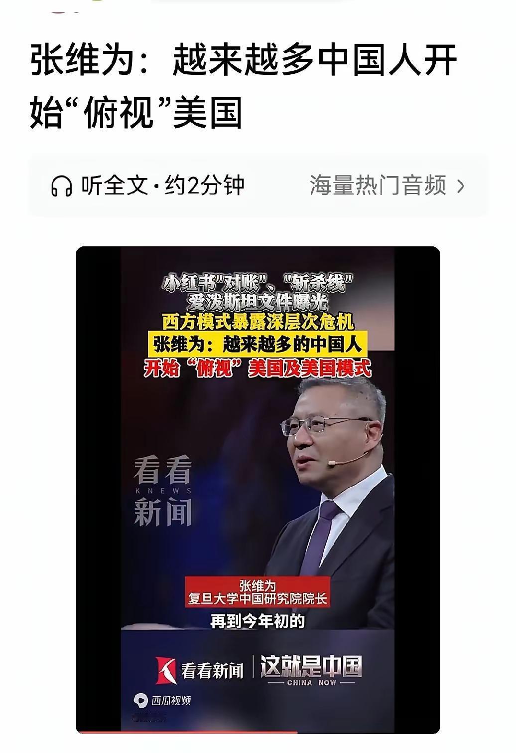 【俯视美国的机会已经成熟?】 张维为提出国人越来越多开始俯视美国,这一点似乎与美国失去国内出国首选地相一致。 那么是不是就能俯视美国?还存在很多争议,双方博弈正在如火如荼,从芯片到制造芯片的设备,美国不仅仅自己卡我们脖子,还要求同盟国一起做,甚至给高端芯片上锁,一旦流入国内自动锁死。 在货币流通上,某些美国议员提出把我们踢出Swift结算系统,甚至还要赔所谓大清朝的欠款等等。 这种步步紧逼,与撕破脸近在咫尺,能不能俯视美国?要看我们敢不敢与美国撕破脸?