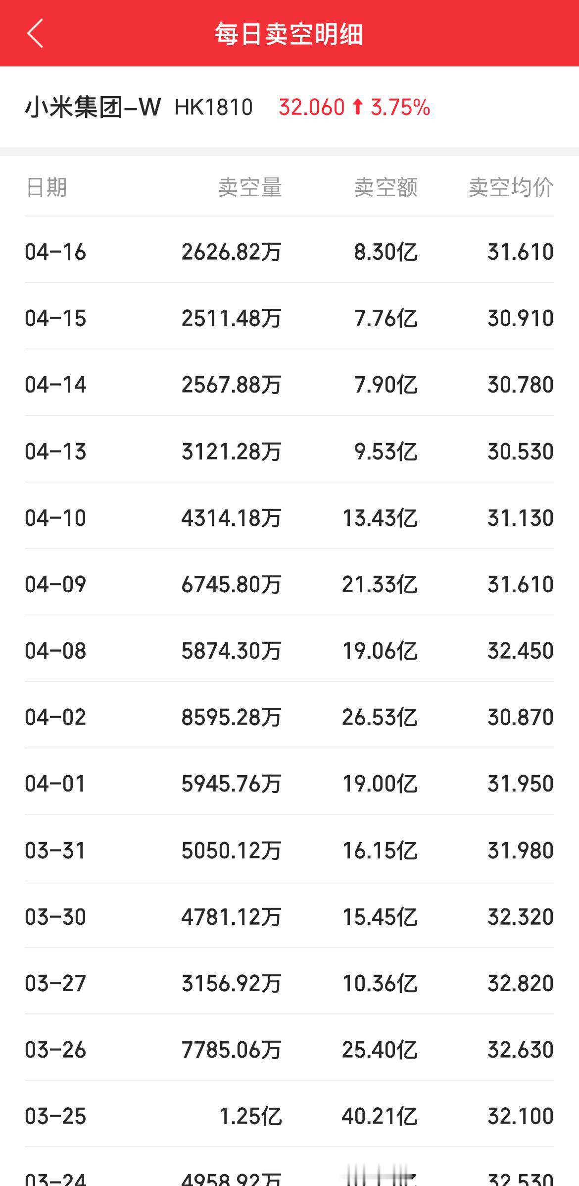小米集团股票卖空资金连续四天维持低位,单日卖空量较之前下降50%以上。 看来雷军最近忙着接见各国政要,重新开启社交媒体和活跃曝光度是有原因的,或许30元的小米股价就是底部了。 同时,阿里巴巴港股涨势很好,但卖空量仍然处高位。