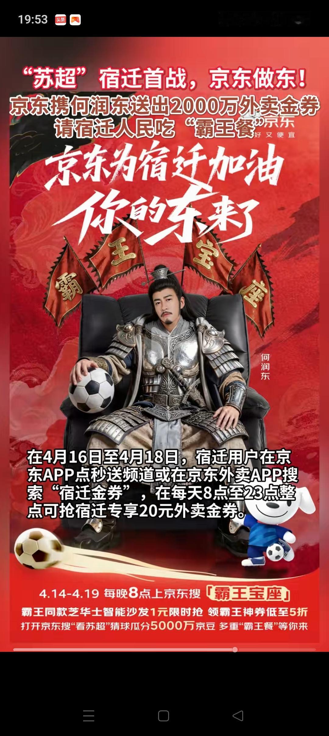 还是京东会整活![捂脸] “苏超”宿迁队首战,京东亲自做东,不仅请来了何润东,还让他扮演项羽出现在赛场。 有消息他会化妆,穿着盔甲,骑着马,尽可能的1:1还原“霸王”登场助兴。 不敢想象,到时候的现场会有多热闹,估计票早就卖光了吧! 而且京东还在当天为宿迁本地人提供了2000万的外卖优惠券,相当于请吃“霸王餐”。 宿迁这一波真的太燃了! 不过要感谢京东,节目效果直接拉满了,搞得大家都很期待周末的比赛[赞][赞]