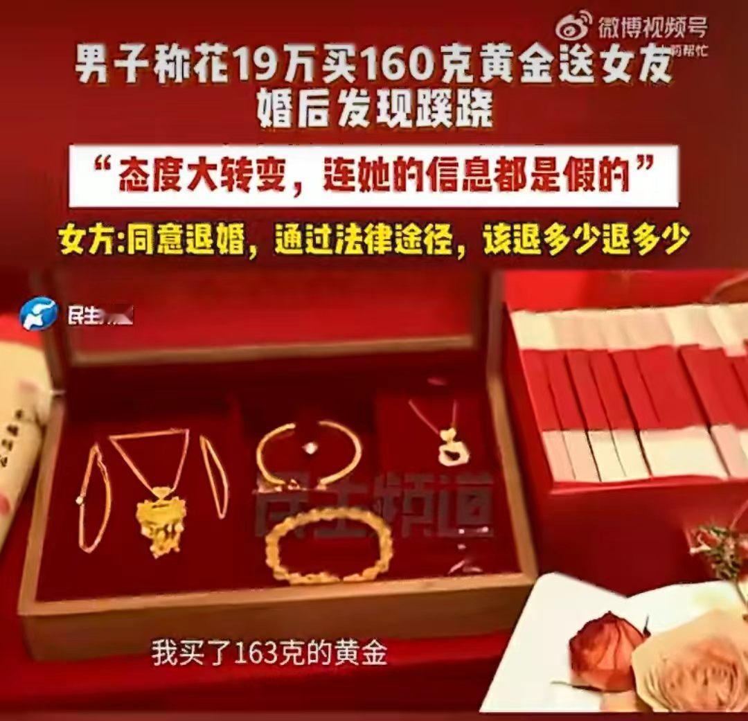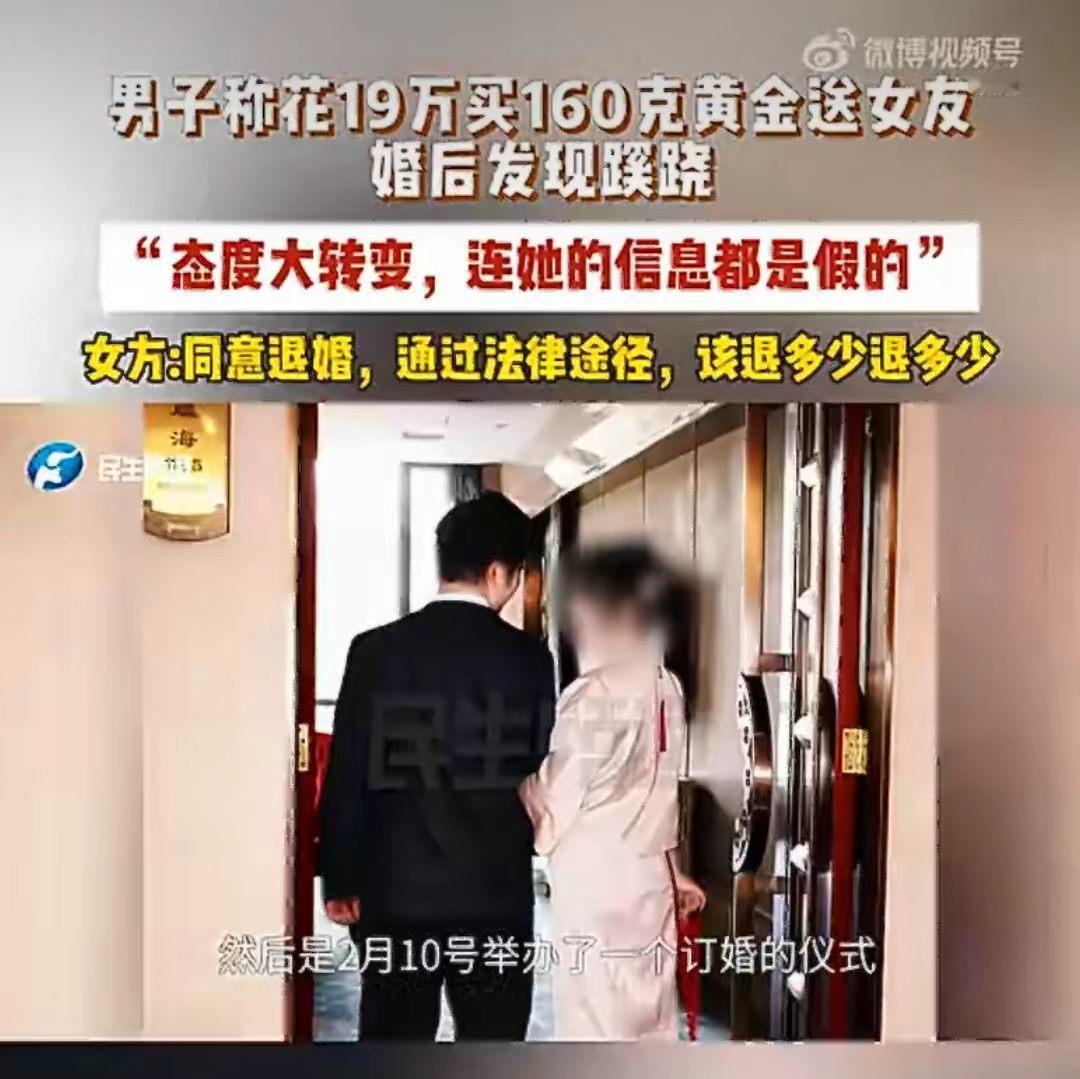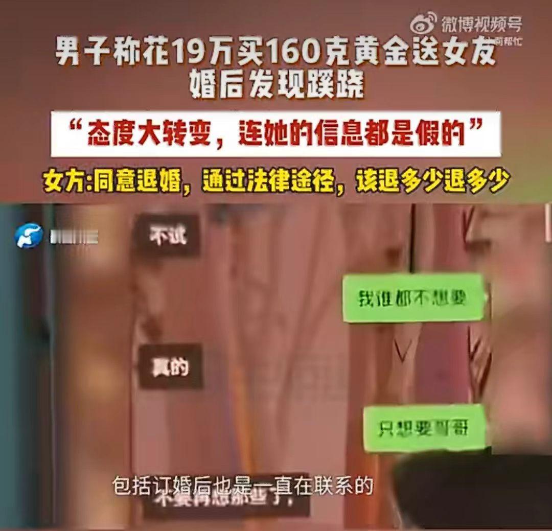 谈了个网恋,订婚花19万给女友买163克黄金,订婚后,女友天天找理由和他吵架,男子反思后,竟然发现24岁的女友事实上36岁,男子接受不了,就提出退婚。 山东的李先生,去年年底在网上打游戏时,认识了一个女生。 两人聊得特别投缘,很快就陷入恋爱,虽然还没见面,但感情却迅速升温。 认识还不到两个月,女生就主动提出我们见见父母、订婚吧,李先生没有多想,觉得能遇到这么好的女生,简直就天上掉馅饼了,就满心欢喜地回家准备婚事。 为了这场订婚,李先生直接拿出19万元,买了163克黄金当作订婚彩礼,可以说是诚意满满。 万万没想到订婚后没多久,女生就像变了一个人,之前很温柔很粘人,现在是三天一小吵、五天一大闹,态度更是变的冷漠又敷衍。 李先生越想越不对劲,就偷偷的留意女生的信息,结果一查吓一跳。 1991年出生,却说是2002年,整整小了11岁;这还不算,结果连名字都是假的,真实身份和她说的完全对不上。 更过分的是,订婚后她还和其他异性暧昧聊天,发消息说“想你了”,而且订婚的朋友圈只设置了几个人可见,根本没公开这段关系。 李先生深受打击,思考再三觉得无法接受,就提出退婚,要求女生返还19万的订婚黄金。 结果倒好女生却倒打一耙,和到处说说李先生恐吓她,还解释自己有两个名字是因为父母离婚,和别的男生去开房只是一起打游戏,没有暧昧。 既然退婚了那彩礼金饰肯定要还啊! 女生嘴上说同意退婚、退金子,却不愿意直接归还,坚持要走法律程序、起诉解决,说该退多少再退多少。 这是准备赖账了。 这明显是打着恋爱、订婚的幌子,骗取高额彩礼吗? 年龄造假、姓名造假、朋友圈造假,每一步都充满谎言,明显的骗子啊! 19万毕竟不是小数目,普通人家攒钱不容易,结果就这样被骗了。 有时候,真心换不来真心,反而可能换来一场精心策划的欺骗。 无论是男方还是女方,在婚恋中都要保持清醒,核实对方真实信息,不要急于投入大量金钱,避免人财两空。 这件事里,你觉得女方该不该全额退还19万黄金?网恋订婚你觉得靠谱吗?评论区说说你的观点。女孩骗男友案 假结婚骗局 订婚 春日生活打卡季