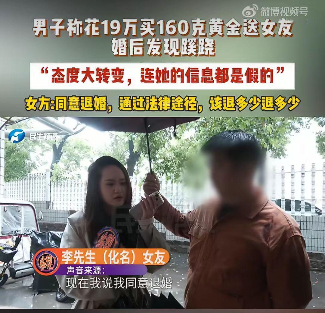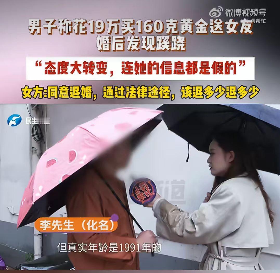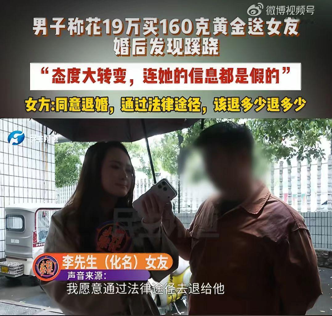 谈了个网恋,订婚花19万给女友买163克黄金,订婚后,女友天天找理由和他吵架,男子反思后,竟然发现24岁的女友事实上36岁,男子接受不了,就提出退婚。 山东的李先生,去年年底在网上打游戏时,认识了一个女生。 两人聊得特别投缘,很快就陷入恋爱,虽然还没见面,但感情却迅速升温。 认识还不到两个月,女生就主动提出我们见见父母、订婚吧,李先生没有多想,觉得能遇到这么好的女生,简直就天上掉馅饼了,就满心欢喜地回家准备婚事。 为了这场订婚,李先生直接拿出19万元,买了163克黄金当作订婚彩礼,可以说是诚意满满。 万万没想到订婚后没多久,女生就像变了一个人,之前很温柔很粘人,现在是三天一小吵、五天一大闹,态度更是变的冷漠又敷衍。 李先生越想越不对劲,就偷偷的留意女生的信息,结果一查吓一跳。 1991年出生,却说是2002年,整整小了11岁;这还不算,结果连名字都是假的,真实身份和她说的完全对不上。 更过分的是,订婚后她还和其他异性暧昧聊天,发消息说“想你了”,而且订婚的朋友圈只设置了几个人可见,根本没公开这段关系。 李先生深受打击,思考再三觉得无法接受,就提出退婚,要求女生返还19万的订婚黄金。 结果倒好女生却倒打一耙,和到处说说李先生恐吓她,还解释自己有两个名字是因为父母离婚,和别的男生去开房只是一起打游戏,没有暧昧。 既然退婚了那彩礼金饰肯定要还啊! 女生嘴上说同意退婚、退金子,却不愿意直接归还,坚持要走法律程序、起诉解决,说该退多少再退多少。 这是准备赖账了。 这明显是打着恋爱、订婚的幌子,骗取高额彩礼吗? 年龄造假、姓名造假、朋友圈造假,每一步都充满谎言,明显的骗子啊! 19万毕竟不是小数目,普通人家攒钱不容易,结果就这样被骗了。 有时候,真心换不来真心,反而可能换来一场精心策划的欺骗。 无论是男方还是女方,在婚恋中都要保持清醒,核实对方真实信息,不要急于投入大量金钱,避免人财两空。 这件事里,你觉得女方该不该全额退还19万黄金?网恋订婚你觉得靠谱吗?评论区说说你的观点。女孩骗男友案 假结婚骗局 订婚 春日生活打卡季