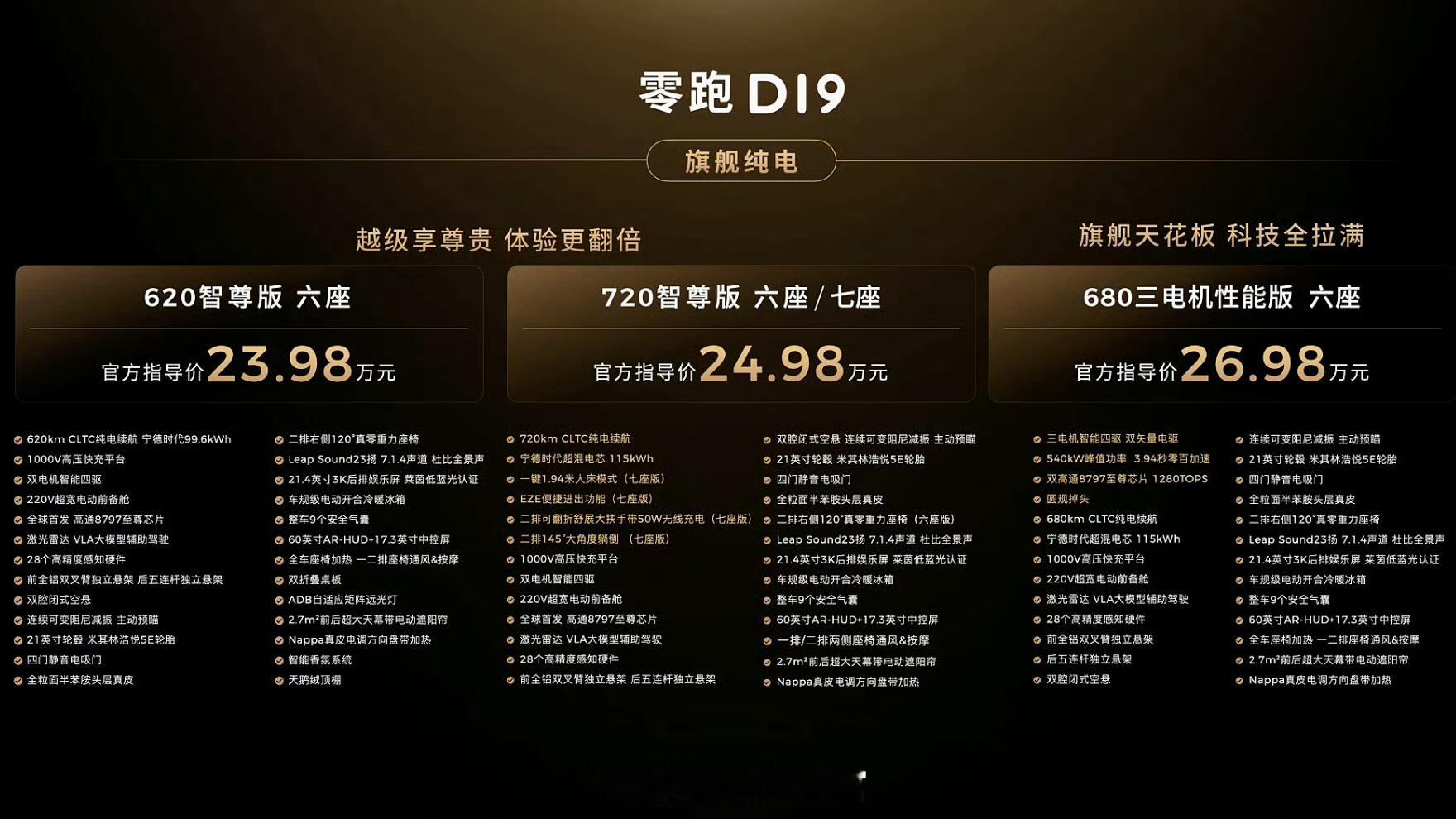 D19 纯电版:-620 公里纯电六座版:23.98 万;-720 公里纯电六座/七座版:24.98 万;-680 公里三电机六座版:26.98 万。