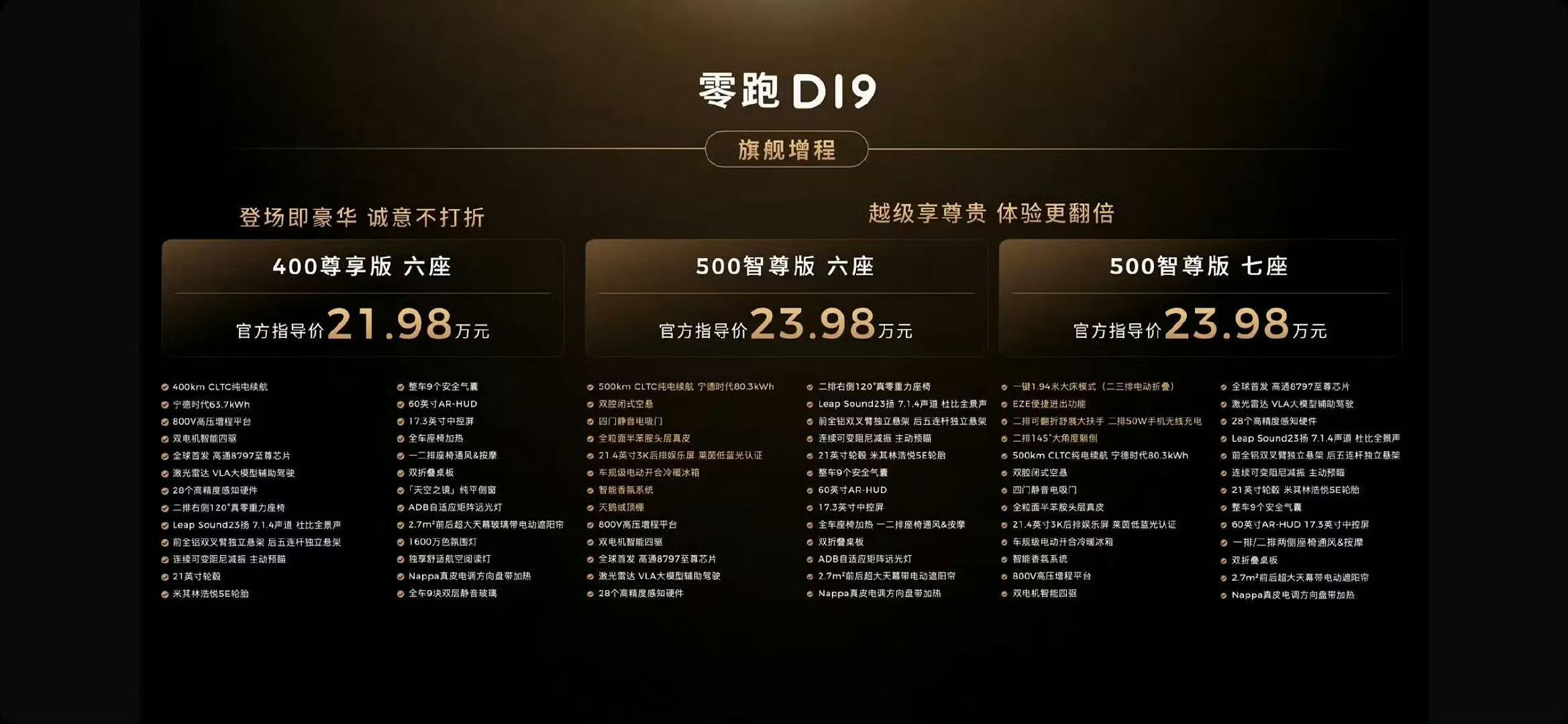 D19 增程版:-400 公里纯电六座版:21.98 万;-500 公里纯电六座/七座版:23.98 万;
