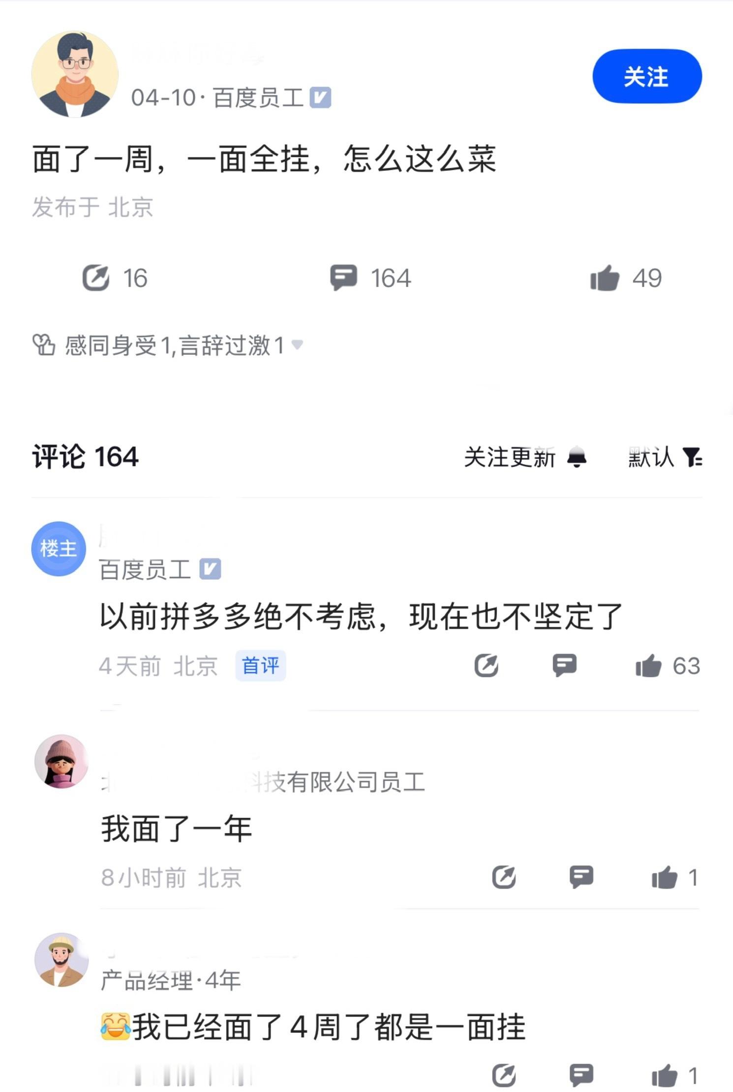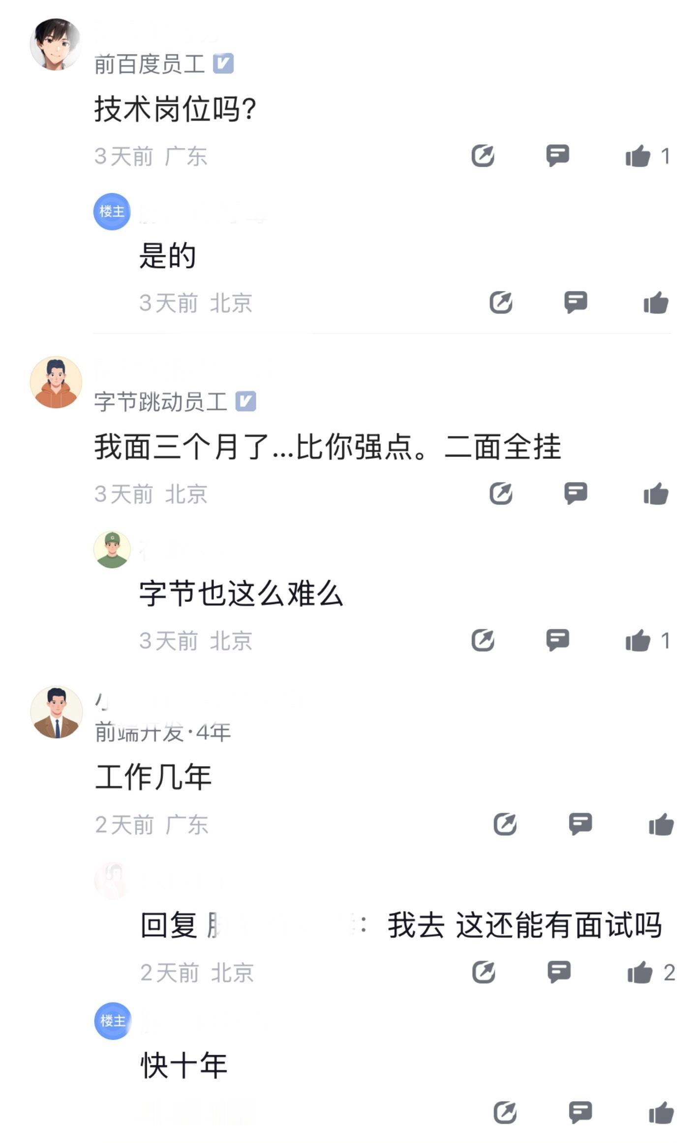 看了一眼评论区,好像还不是个例,有人说自己面了4周,都是一面挂,甚至连字节员工也表示,“面了三个月,二面全挂”。