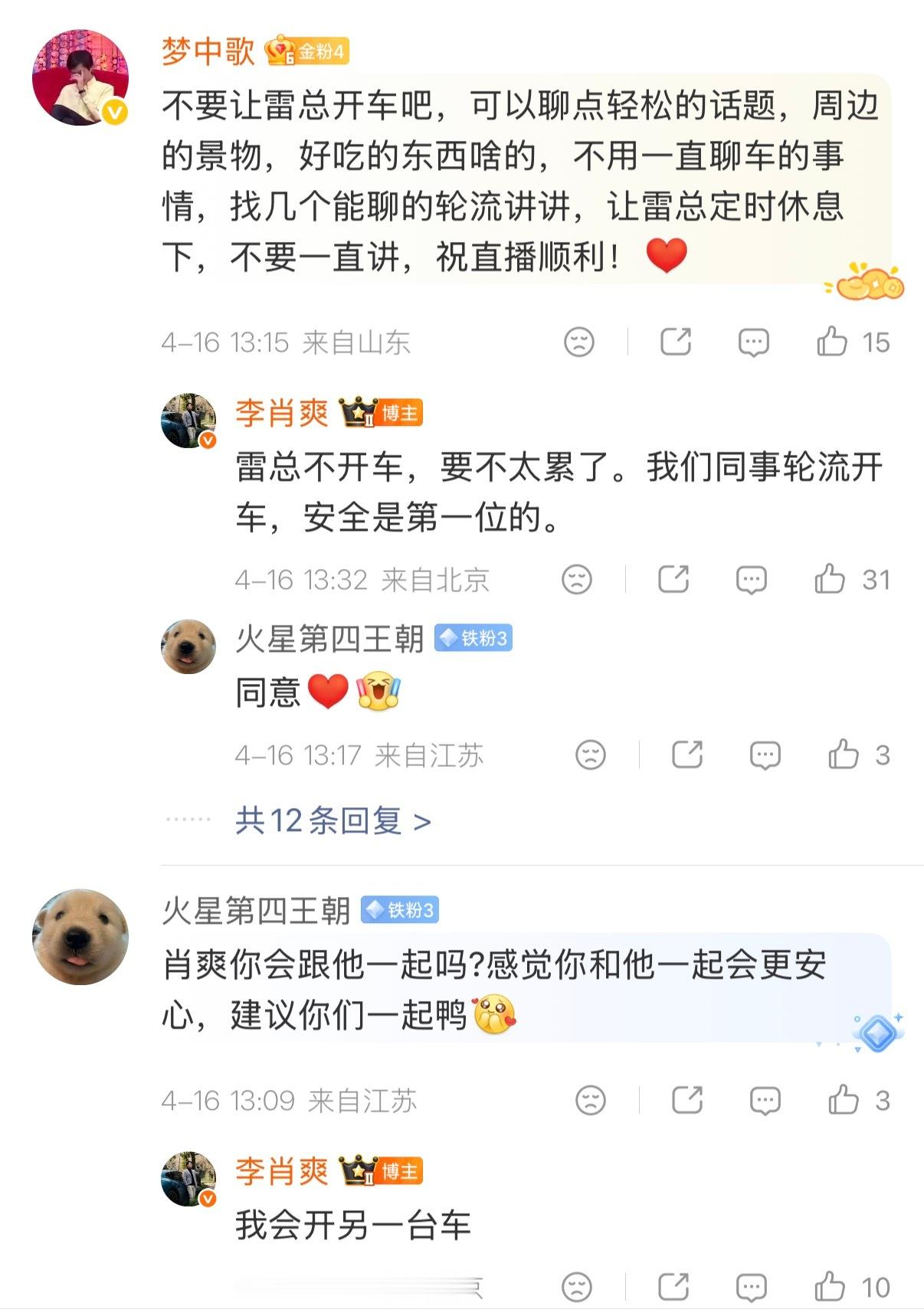 小米李肖爽透露,雷总明早直播不开车,由同事轮流开,安全是第一位的。