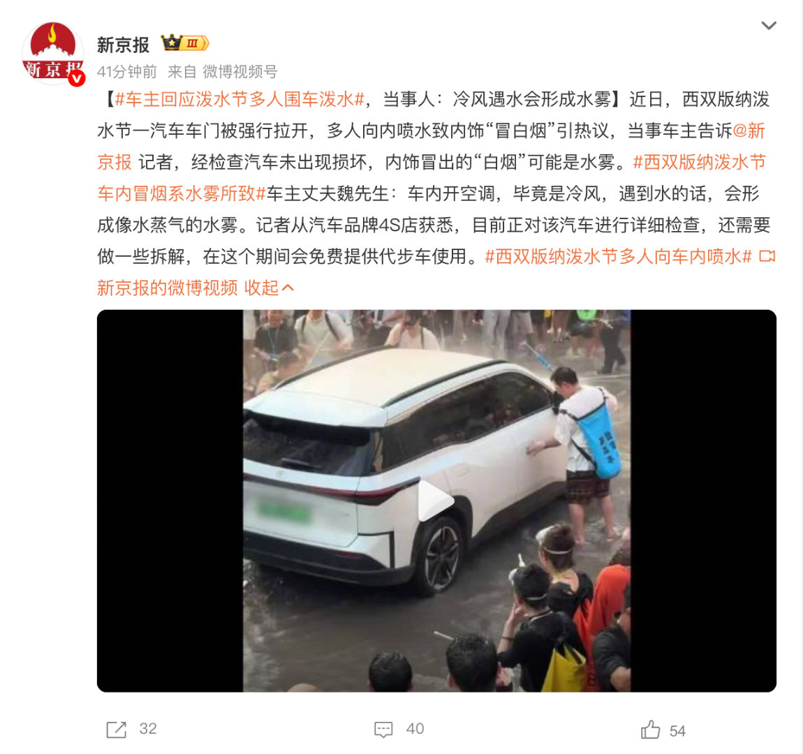很多人光顾着看热闹了,但其实这件事最该夸的不是乌龙本身,而是广汽丰田对车主的态度——事情起因是在西双版纳一辆广汽丰田铂智3X被一群人围着往车里泼水,当时冒的“白烟”吓懵不少人,还好车主后来澄清了,就是冷气遇水的水雾,不是故障但我关注到的重点是,品牌反应速度真的太快了,第一时间找到车主、安排到店全面检测,直接给出官方结论:三电和电路完全正常,无隐患、之后免费清洁、除湿、整备一条龙,连车主返程沿途都安排好保障~不甩锅、不拖延,原因讲得明白,处理也非常到位,不仅车够硬,售后更稳,这才是一个品牌该有的担当!车主回应泼水节多人围车泼水西双版纳泼水节车内冒烟系水雾所致