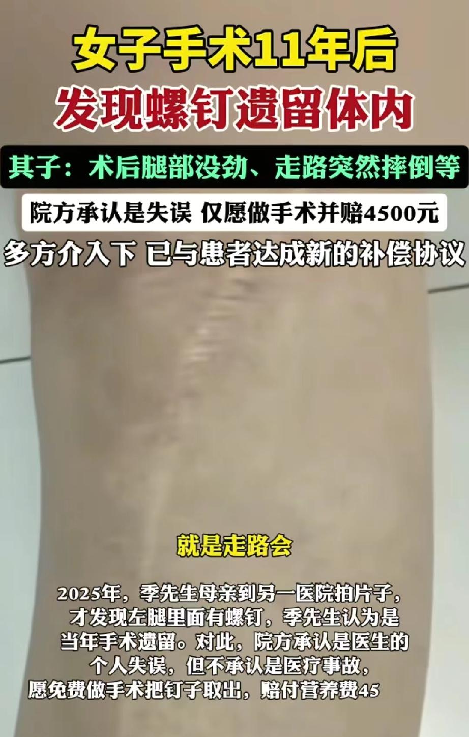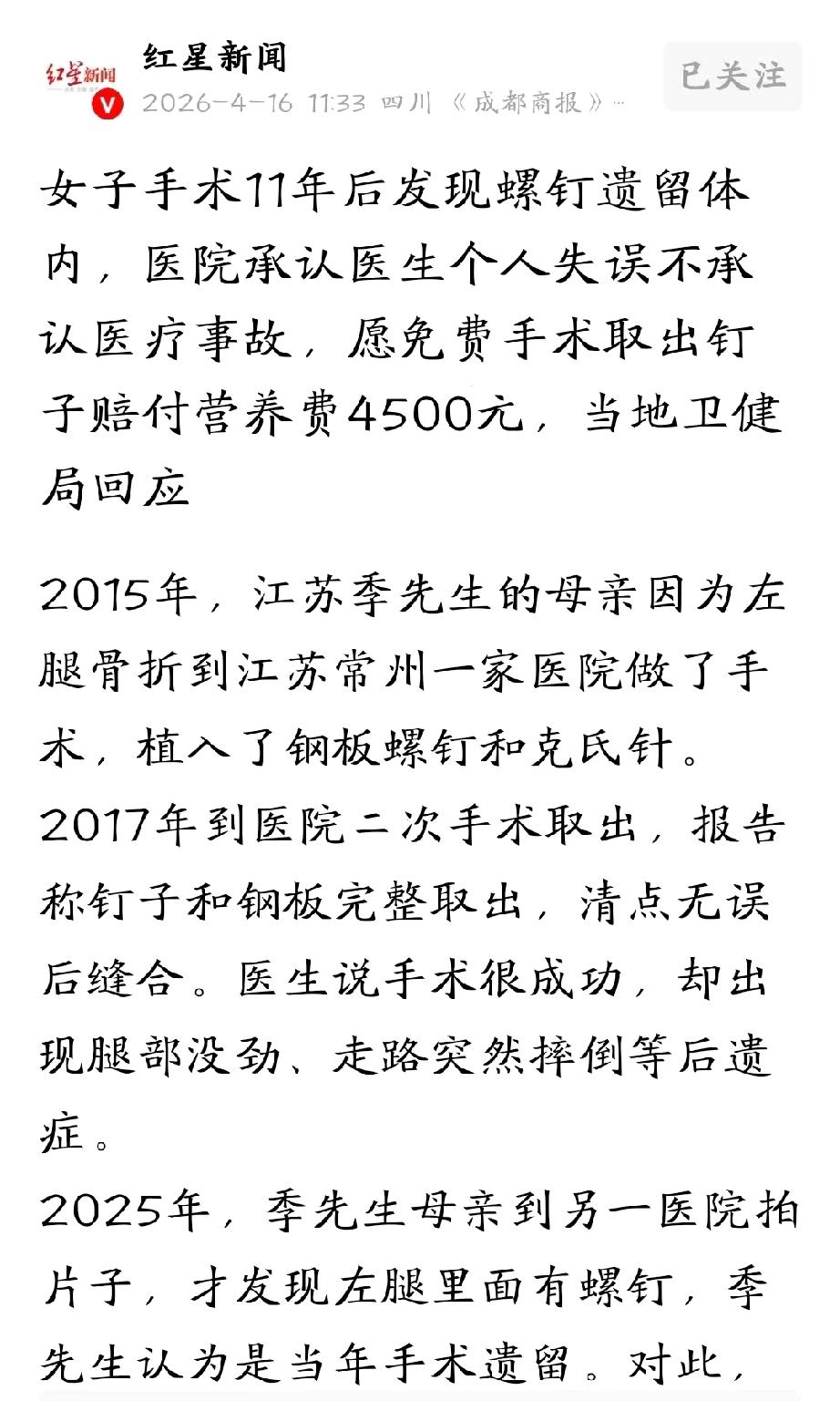 江苏常州,老人手术后,医生不小心把一个螺丝钉落在体内,导致其被病痛折磨8年。事后,医院承认医生存在失误,但只愿承免费给老人取出螺丝钉,并赔偿4500元营养费。 2015年,季大妈因左腿骨折,住进了当地一家医院接受手术。 骨折手术很顺利,医生给她的腿里植入了钢板、螺钉还有克氏针,身体也一天天康复起来。 两年后,2017年,季大妈恢复的挺好,做了二次取钉手术。术后报告也显示:钉子和钢板完整取出,清点无误后缝合。 主刀医生还特意告诉她,手术特别成功,回去好好养养就能跟以前一样了 。 季大妈当时特别放心,信以为真,每天安心在家休养。 可没想到,从那以后,她的左腿就不对劲了,总是没力气,走路的时候还会突然摔倒。 家里人一开始以为是老人年纪大了,恢复得慢,没往别的地方想,只当是术后留下的小毛病,慢慢熬着就过去了。 这一熬,就是整整8年。 直到2025年,季大妈因为腿脚不便,去了另一家医院拍X光片。 片子刚出来,医生就皱着眉指着屏幕上一处亮白色的异物表示:季大妈之所以经常腿疼,是因为腿里面有一枚螺钉没取出来。 季先生当时就懵了。 他反复确认报告,2017年那场手术,明明写着“完整取出、清点无误”,怎么会多出一枚螺钉? 季先生这才反应过来,母亲这8年的腿疼、摔倒,全是这枚被遗留在体内的螺钉闹的。从2015年手术植入到2025年发现,这枚螺钉,在母亲腿里整整留了11年。 季先生赶紧带着母亲找到当年做手术的医院讨说法。 院方经过核实,季大妈腿里的螺丝钉确实和他们脱不了干系,只能乖乖承认,这确实是2017年取钉手术时,医生个人操作失误,漏取了一颗螺钉。 事实虽然清楚,可接下来医院的态度,让季先生怎么也接受不了。 医院一口咬定,这事儿不算医疗事故,只愿意免费给老人做二次手术把螺钉取出来,再额外赔付4500元营养费。 4500元,能弥补老人8年的痛苦吗?能抹平家人这些年的奔波和糟心吗?季先生当场拒绝了这个方案,转身就向卫健委提交了投诉。 卫健委很快受理了此事,但迟迟没有给出明确的处理意见 。 后来,在记者的陪同下,卫健委相关负责人才解释:一件事儿算不算医疗事故,得由专业的鉴定机构来认定,他们能做的是出面再次组织双方调解 。 好在,有记者的帮助,经过多方协调,医院已经和患者家属达成了新的补偿协议,彻底解决了这桩困扰了季大妈11年的烦心事。 《民法典》第一千二百一十八条规定:患者在诊疗活动中受到损害,医疗机构或者其医务人员有过错的,由医疗机构承担赔偿责任。 医院已承认2017年取钉手术因医生失误漏取螺钉,违反手术操作规范,明显存在医疗过错。 螺钉遗留体内11年,致季大妈8年腿疼、无力、摔倒,这样的人身损害与过错有直接因果关系,医院应承担全部赔偿责任,而不是仅4500元的营养费。 医生的失误属于医疗损害责任纠纷,无论是否认定为“医疗事故”,医院均应依法赔偿。 季大妈完全可以主张医疗费、误工费、护理费、精神损害抚慰金等一系列赔偿,这些计算下来,肯定远高于4500元。