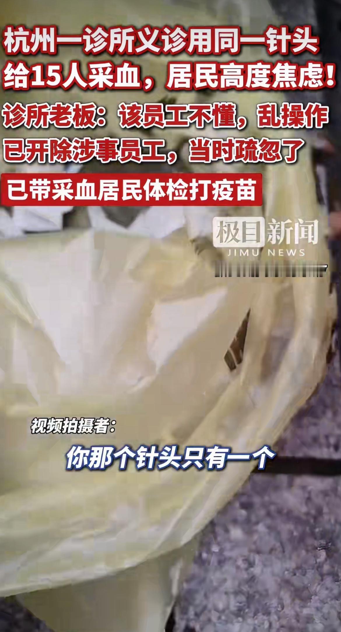“太离谱!”杭州诊所免费义诊测血糖,用同一根针头给15个人采血,被发现了还嘴硬说换了,大伙翻遍垃圾袋都找不到废弃针头,结果诊所老板的回应,把责任推得干净! 杭州滨江区一家诊所进小区做义诊的时候,居然用同一个针头给多个居民采血,当时小区物业联合诊所搞便民活动,免费给大家测血糖,不少老人都想着过来查一查身体,本来是好事,没想到中途出了岔子。 有居民在排队的时候发现不对劲,工作人员采血的时候好像没换针头,就当场问对方是不是每次都更换了针头,工作人员当时回答得很肯定,说每次都换了。 可在场的人还是不放心,就去翻了现场装医疗垃圾的袋子,结果翻来翻去,里面一个用过的废弃针头都找不到。 这下大伙都急了,围着工作人员质问,说这么多人采血,难道就用一根针?针头重复用是会传染病的,这是严重违规的事。面对大家的质疑,现场的工作人员支支吾吾,半天也说不出个合理的解释。 居民把现场的视频发到了网上,说这次测血糖前后有大概15个人被同一个针头采了血,现在最担心的就是感染传染病,毕竟不少病毒的潜伏期能有半年,接下来的日子都要在担心里过,正常生活和工作都受影响。 涉事诊所的负责人承认确实有这么回事,说这场义诊是免费的公益活动,本来是想给居民办好事,没想到出了这种纰漏。负责人说已经安排这15位居民做了体检,还给大家打了艾滋病阻断针、乙肝疫苗这些,尽可能降低感染风险。 提到为什么会出现这种低级错误,负责人表示是当时负责采血的员工不懂专业知识,操作不规范,已经把这名员工开除了。至于为什么会让不懂专业的人来做采血工作,负责人解释说当天活动现场太忙,诊所人手不够,一时疏忽了。 负责人还说,事发之后当地相关部门已经多次和他沟通,自己会配合后续的所有处理,不会逃避责任,不过有部分居民提出要高额精神损失费,这个要求他暂时没有答应。 小区所属的社区工作人员说这次义诊是物业牵头组织的便民活动,后续物业也会配合各方做好后续的处理工作。目前滨江区卫健局已经介入,正在对整个事件进行调查处理。 不管是看病还是做相关检查,一定要留意医疗操作是不是规范,遇上违规情况要及时制止。大家对这件事有什么看法?欢迎在评论区聊聊你的想法,点赞转发给身边的家人朋友,点关注,后续事件的调查进展我们会第一时间更新。华境S全球首秀标配华为乾崑 大众9X预售发布 可爱多一点,干爽多一点 来源:极目新闻