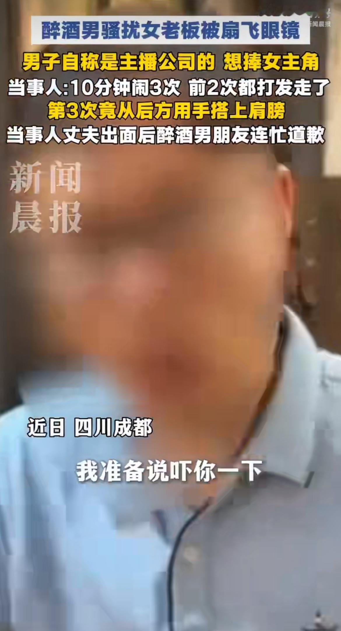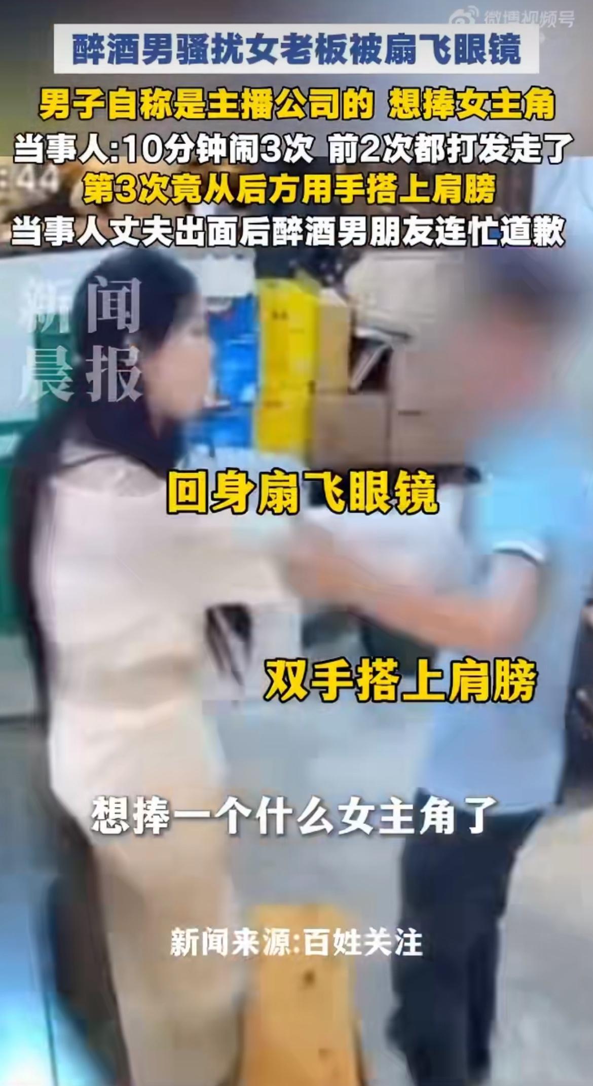 “打的好!”喝了点酒就对火锅店女老板动手动脚,还满嘴跑火车说自己是主播公司的要“捧她当女主角”?成都这骚扰男刚摸完女老板的脸,转头就挨了一耳光,眼镜都被扇飞,等女老板丈夫一过来,他那伙朋友的反应绝了! 四川成都一家火锅店的女老板邹女士正在店里忙活,遇上了一名酒后失态的男顾客。这名男子当天和朋友一起到店里吃火锅,喝了不少酒之后,前后短短十分钟里就找邹女士搭讪了三次。 前两次他都喊邹女士过去和他们一起喝酒,还自称是某主播公司的工作人员,说可以“捧女主角”,邹女士想着对方是来消费的顾客,不想闹得太难看,第一次委婉拒绝之后,第二次还特意给他们桌送了一盘花生米,好言好语劝他们先好好吃饭喝酒,算是把人打发走了。 没想到这名男子根本没打算就此罢休,第三次他从厕所出来之后,直接走到邹女士身后,伸出双手搭在了邹女士的肩膀上,甚至还伸手摸了邹女士的脸。这下邹女士彻底忍不了了,当场就和对方对峙,质问他摸自己脸、靠自己肩膀是什么意思,还反问店里有监控,他怎么敢做出这种事。 被当场拆穿之后,这名醉酒的男子还嘴硬,说监控随便拍随便看,自己只是想吓邹女士一下。这话把邹女士气得不行,当场就明确告诉对方,自己是开火锅店做生意的,不陪酒,忍无可忍之下直接反手一耳光,把男子的眼镜都扇飞了。 之后邹女士的丈夫得知了这件事,直接找到这桌顾客要说法。刚才还嘴硬的醉酒男子没说话,反而是他同行的朋友赶紧出来打圆场,不停地道歉,说他是喝多了意识不清,希望别跟他一般见识。 不少网友都夸邹女士反应果断,遇到骚扰就该当场硬刚,也有人吐槽这名男子拿“喝多了”当挡箭牌,还有人调侃他说的“捧女主角”的套路实在太老套。 你对这件事怎么看?要是遇上类似的骚扰会怎么处理?欢迎在评论区聊聊你的看法,觉得文章有用的话别忘了点赞、转发给身边的朋友,点关注,后续更多民生热点咱们第一时间跟进。大众9X预售发布 可爱多一点,干爽多一点 华境S全球首秀标配华为乾崑 来源:新闻晨报 百姓关注