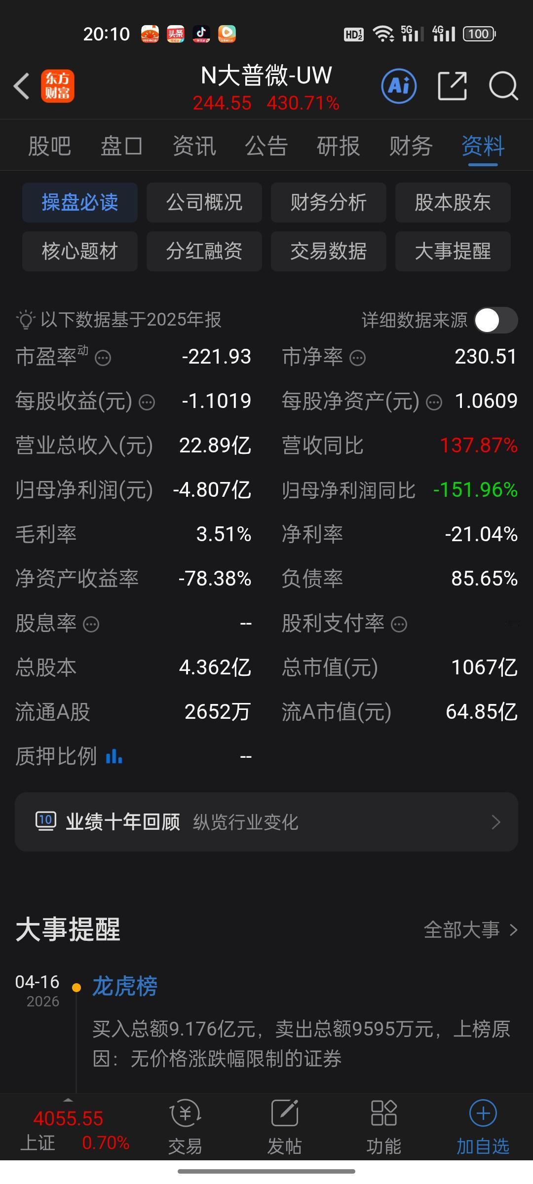 中一签赚近10万!大普微首日暴涨430%,创业板首家未盈利企业杀疯了! 各位老铁们,今天A股真的太疯狂了!一只新股上市首日就暴涨430%,中一签最高能赚近10万!这种大肉签,你中了吗? 大普微今天正式登陆深交所创业板。开盘就高开近350%,报207.23元/股,市值一下子冲到904亿元。这还不算完,盘中更是一路狂飙,最高涨到255元,涨幅超过430%,总市值一度突破1000亿! 给你算一笔账:发行价46.08元/股,中一签500股,如果你在盘中最高点卖出,浮盈接近10.45万;就算收盘价244.55元卖出,也能赚9.92万。这是什么概念?很多人一年的工资都没这么多! 凭什么这么火?背后有三大硬核逻辑。 第一,踩准了AI时代的超级风口。 大普微是做啥的?数据中心企业级固态硬盘,也就是企业级SSD。简单说,AI大模型训练、云计算、大数据,都离不开海量数据的高速读写,而这正是企业级SSD的主场。 大普微是业内领先、国内极少数具备企业级SSD“主控芯片+固件算法+模组”全栈自研能力的企业,搭载自研主控芯片的出货比例超过75%。这种全栈自研的能力,在国产替代的大背景下,含金量不言而喻。 第二,营收增速猛,客户全是顶级大厂。 虽然还没赚钱,但大普微的营收确实在飞速增长。2022年到2024年,营收从5.57亿涨到9.62亿,2025年预计直接干到20.5亿到23.5亿。 客户名单更是亮眼——Google、字节跳动、腾讯、阿里、三大运营商……全球头部的AI和云计算厂商,几乎都在它的供应链里。 第三,它创造了历史——创业板首家未盈利上市企业。 大普微是创业板第三套上市标准启用后,首家成功上市的未盈利企业。说白了,它打破了过去“不赚钱就不能上市”的旧规矩,给那些技术过硬但还在烧钱阶段的硬科技企业打开了一条新路。市场给的430%涨幅,就是对这种制度突破的最大认可。 但别光看热闹,这公司还没赚钱呢! 讲真,大普微虽然营收跑得快,但亏损也是实打实的。2022年到2024年,分别亏损5.34亿、6.17亿、1.91亿,2025年上半年又亏了3.54亿。 为啥亏这么多?研发投入太大!2022年到2024年三年研发费用累计7.37亿,而且还在继续加码。这种“增收不增利”的模式,在硬科技领域其实很常见,但作为投资者,你得心里有数。 公司自己也说了,预计最早2026年才能整体扭亏为盈。 大普微首日暴涨,表面看是中签股民的狂欢,背后折射的却是A股对硬科技的饥渴和资本市场制度的进步。但股市从来都是机会与风险并存,430%的涨幅里有多少是真实的成长预期,又有多少是情绪的泡沫,你得自己掂量。 “风口上的猪都能飞,但只有长出翅膀的才能飞得更远。” 注:本文仅为信息分享,不构成任何投资建议。