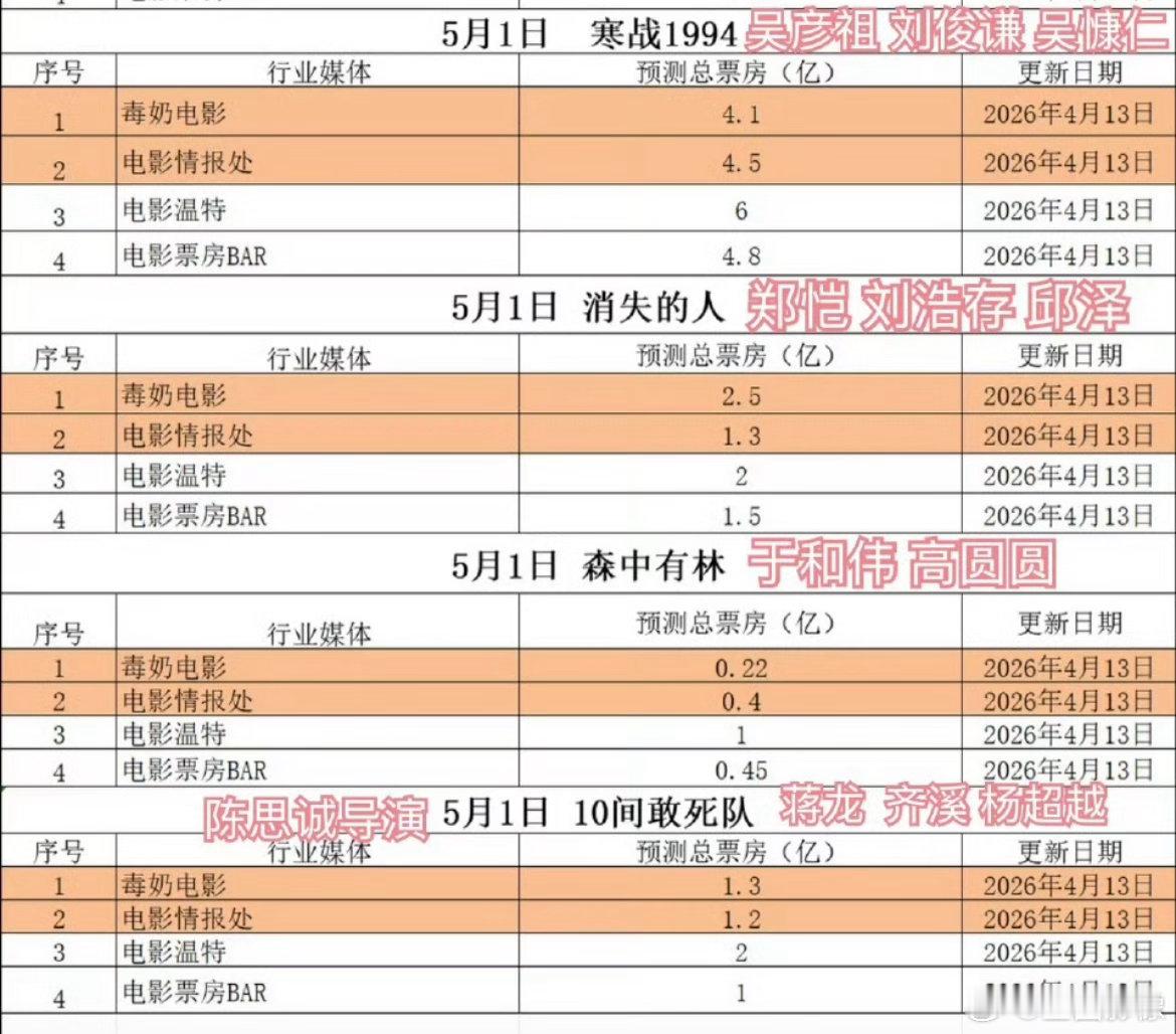 陈思诚五一档电影这么不被看好?电影机构预测《10间敢死队》只有一个亿票房。