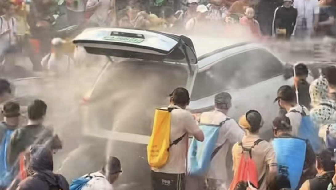 视频显示,泼水节现场,一辆白色轿车被多人围堵在道路中间,移动缓慢,有人拉开车辆后备箱与一侧车门,持续向车内泼水。