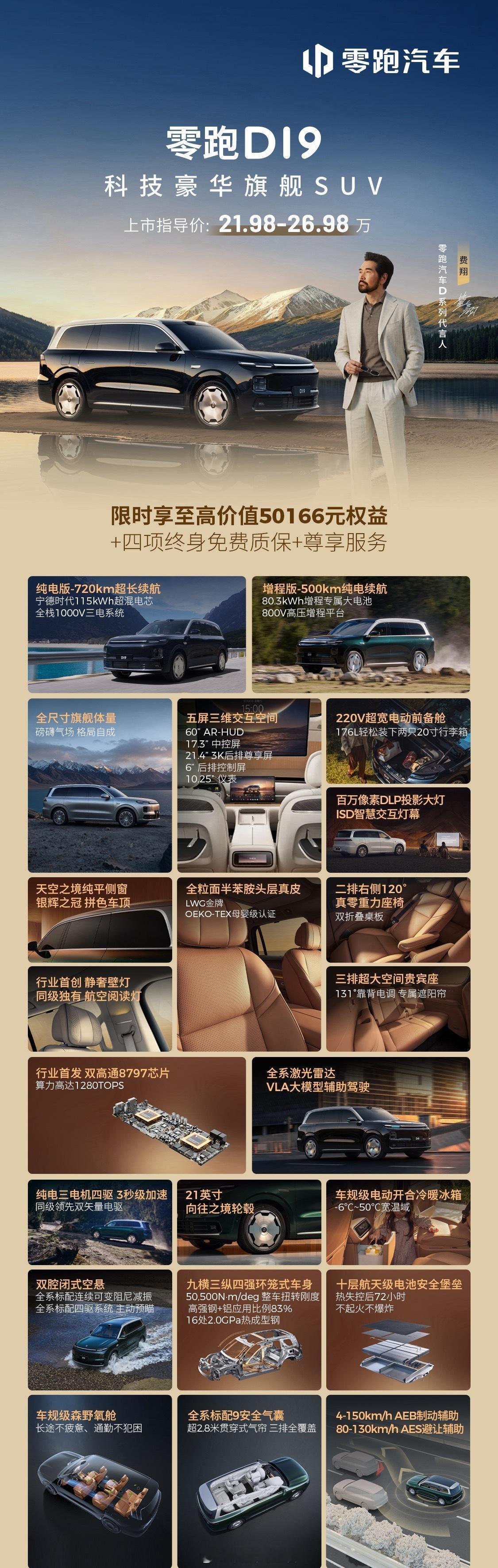 D19 上市指导价:21.98-26.98万元30万内全尺寸旗舰SUV搅局者顶级配置、品质和供应链 很多百万的配置都干到了30万之内是不是太卷了?零跑d19满配豪华上市21.98万起零跑汽车原来9系旗舰SUV价格也能这么香
