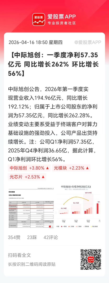 中际旭创业绩炸裂,一季度暴涨57.35亿元,同比增长262%,环比增长56%。确实太猛了!