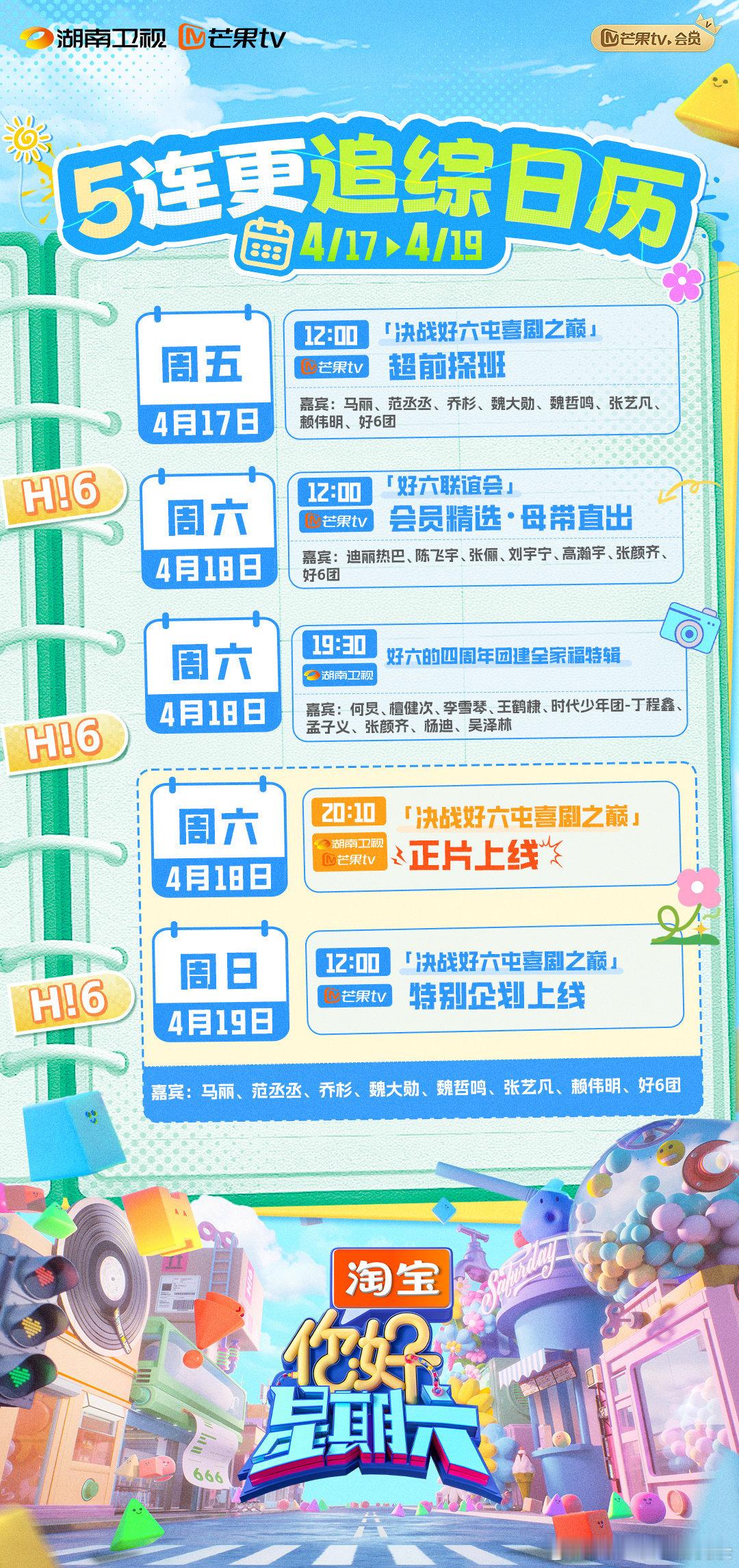 你好星期六这周5连更你好星期六你好星期六的追综日历来啦!决战好六屯喜剧之巅,好六联谊会,好六的四周年团建全家福特辑,爱看综艺的有福了!
