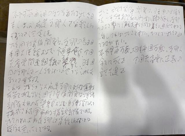 中国驻日大使馆接连遭到恐怖威胁中国驻日大使馆接连遭到恐怖威胁这是中国驻日大使馆今天给出的,日本极端人物投递的威胁信原件证据。已经3月5日向日本方面报警,要求注意保护,结果3月24日还真的有自卫队现役军官怀揣利刃闯进了中国大使馆。已经造成严重事件了。没想到一周后又来了一封威胁信。历史上,日本人袭击外国政要使节的事情并非孤例。当年俄国皇太子被袭击受伤的犯人津田三藏就是警察。日本在极端思潮教育下成长的一代,极为容易形成偏执和极端人格,酿成反社会惨剧。