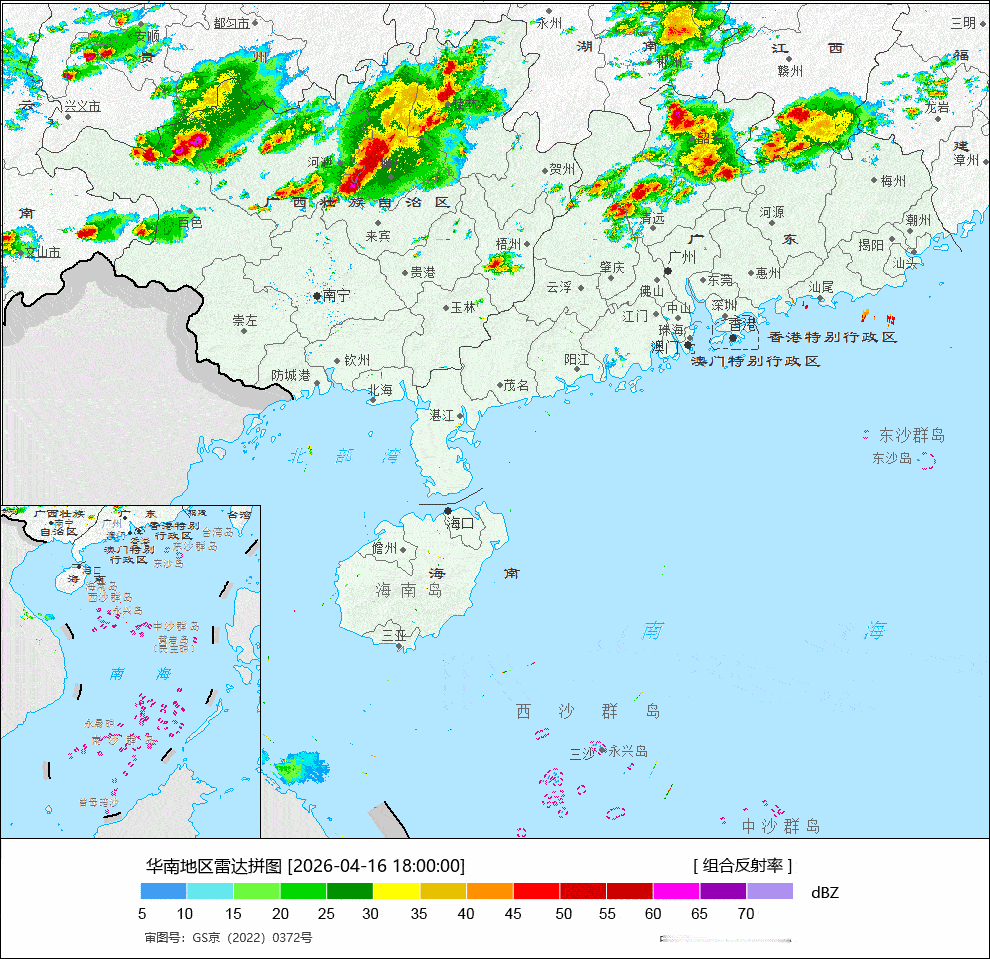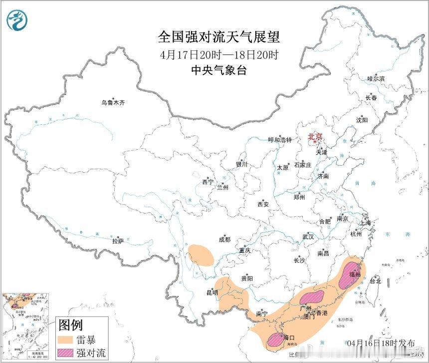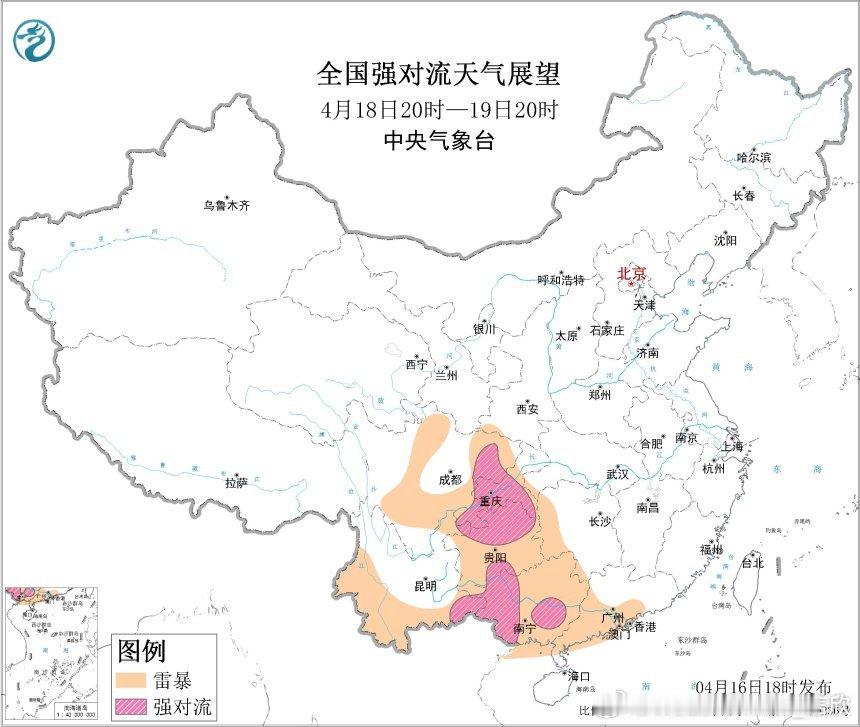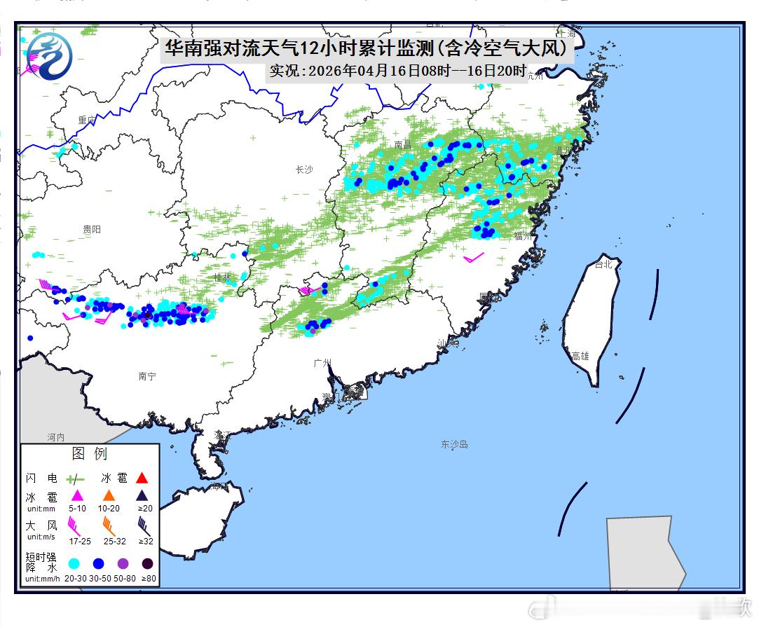 今晚中央气象台继续发布强对流天气蓝色预警:预计4月16日20时至17日20时,华南和东北地区中部等地的部分地区将有8级以上雷暴大风或冰雹天气,其中,广西西部和东部、广东北部等地的部分地区将有10级以上雷暴大风;华南等地的部分地区将有小时雨量大于20毫米的短时强降水天气,其中,广西西部、广东北部等地的部分地区小时雨量大于50毫米。