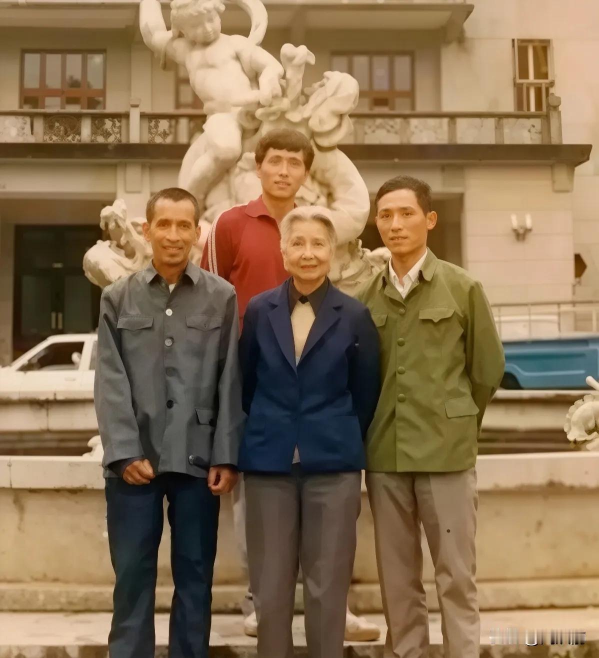 这张照片是革命前辈曾志女士和她的家人在井冈山的合影留念。 左边那位是当年他寄养在农民家的儿子,名字叫石来发,他身穿灰色中山装,深色裤子。曾志身穿蓝色西服,神情自若。他是一位杰出的老一辈无产阶级革命家,此次合影是纪念井冈山根据地建立60周年时拍照的。