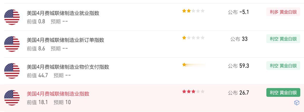 今晚美国4月费城联储指数公布。 首先美国4月费城联储制造业指数 26.7, 市场预期10,前值18.1。 其次美国4月费城联储制造业物价支付指数 59.3,前值44.7。 最后美国4月费城联储制造业新订单指数 33,前值8.6。 还有美国4月费城联储制造业就业指数 -5.1,前值0.8。 今晚这四项数据, 有三项数据是利空金价的。 但是数据公布以后,未能引发金价下跌。
