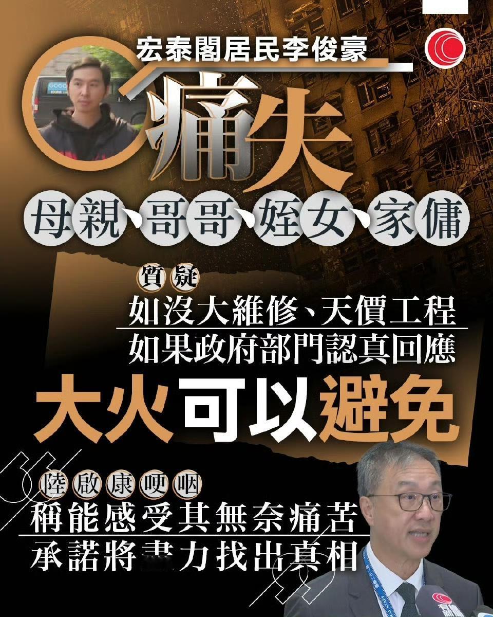失去母亲、哥哥、侄女及家庭工人姐姐的李俊豪在宏福苑听证会上质疑如果没大维修、如果没有天价工程、如果港府部门认真回应,这场大火可以避免,他家人及家佣亦不会罹难。 委员会主席陆启康哽咽,指感受到他的无奈及痛苦,承诺委员会将尽力找出真相。