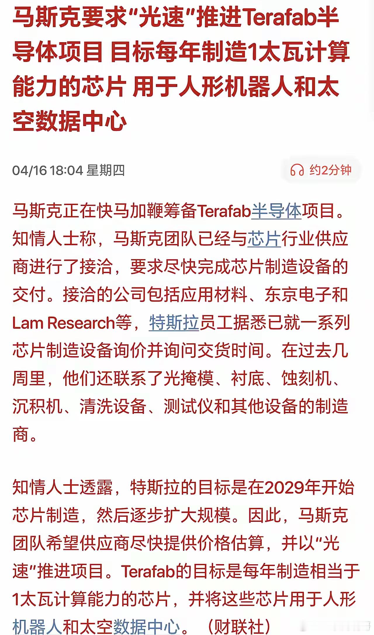 重大利好!马斯克要求“光速”推进进Terafab半导体项目,明天A股的半导体设备有希望表现了?