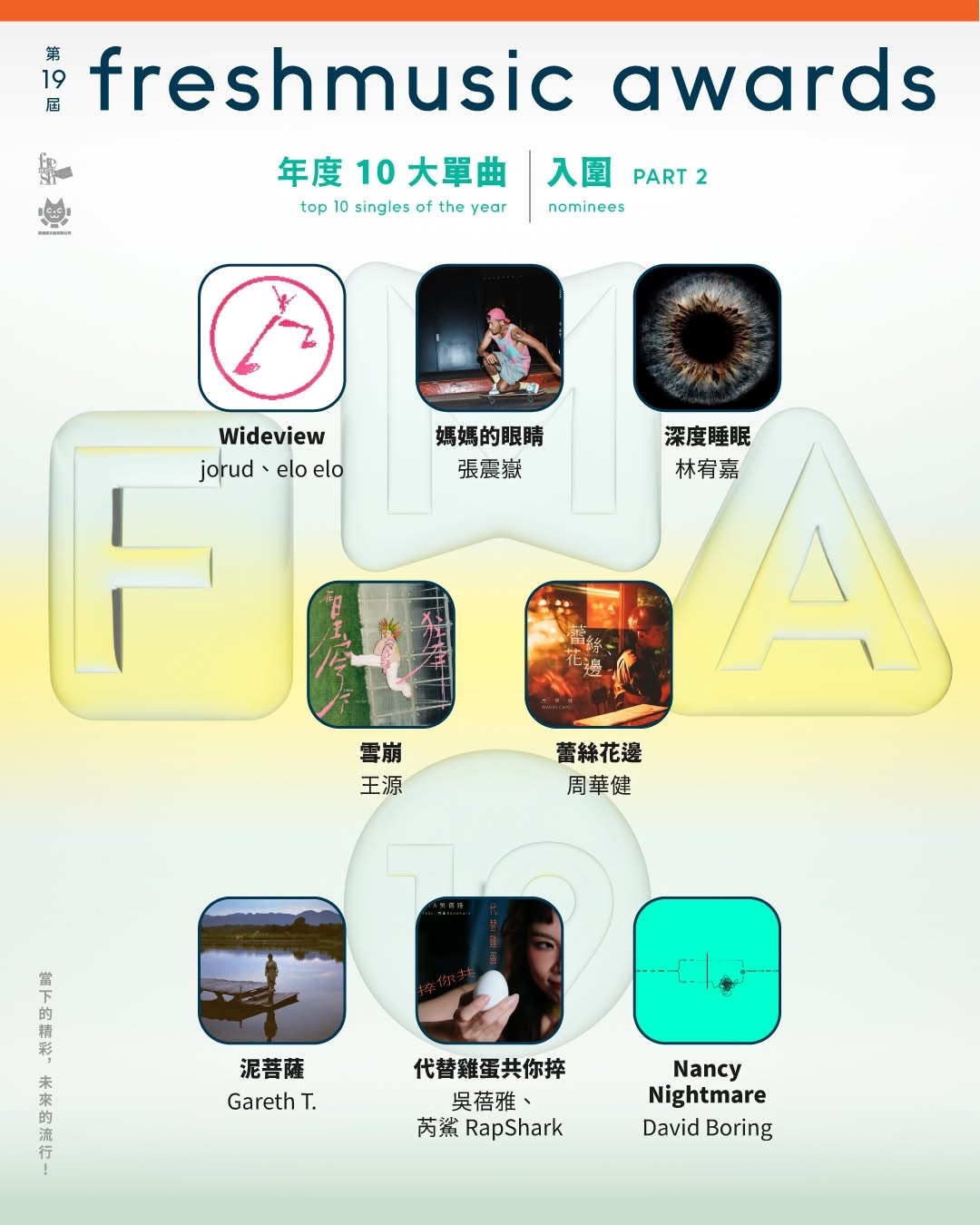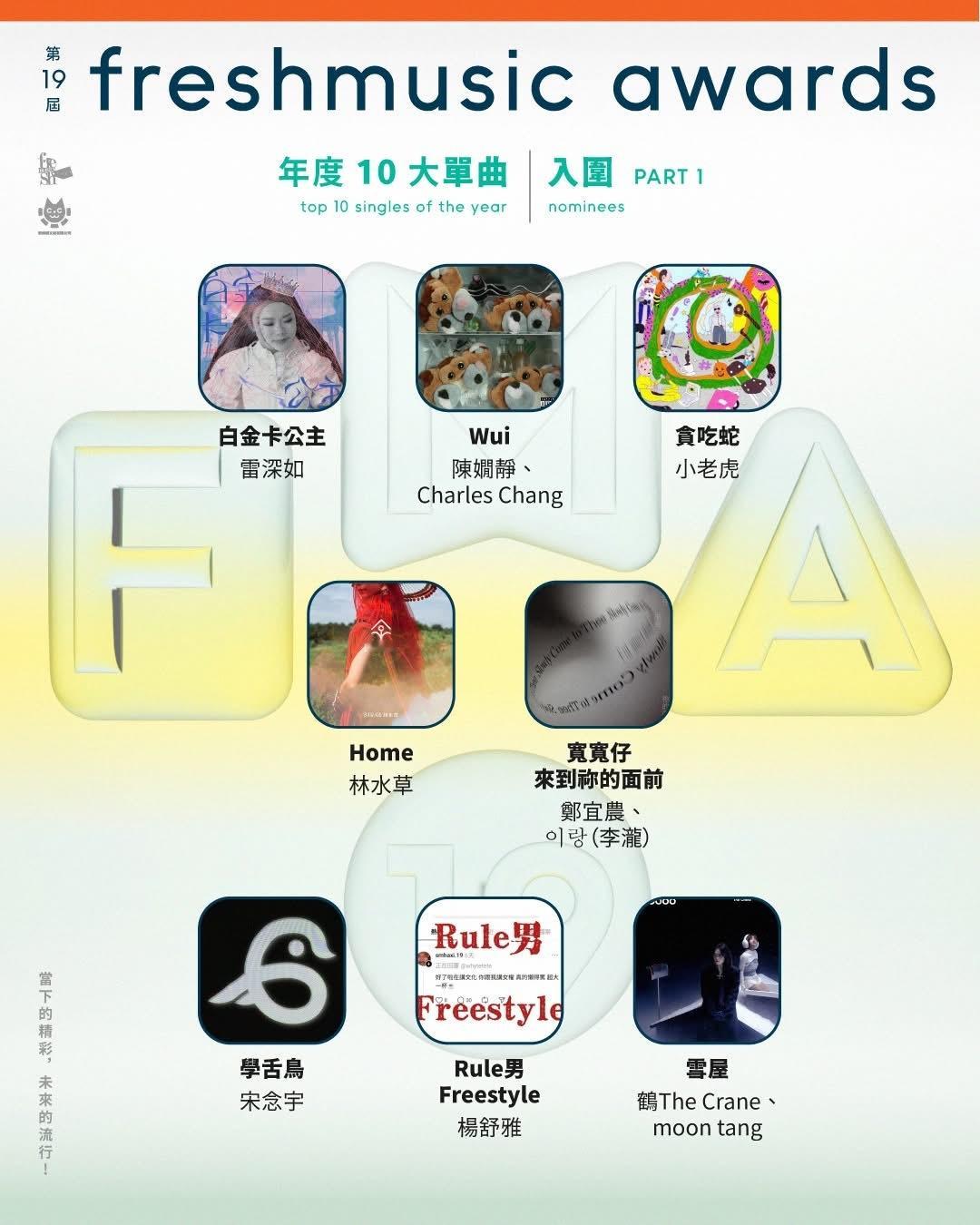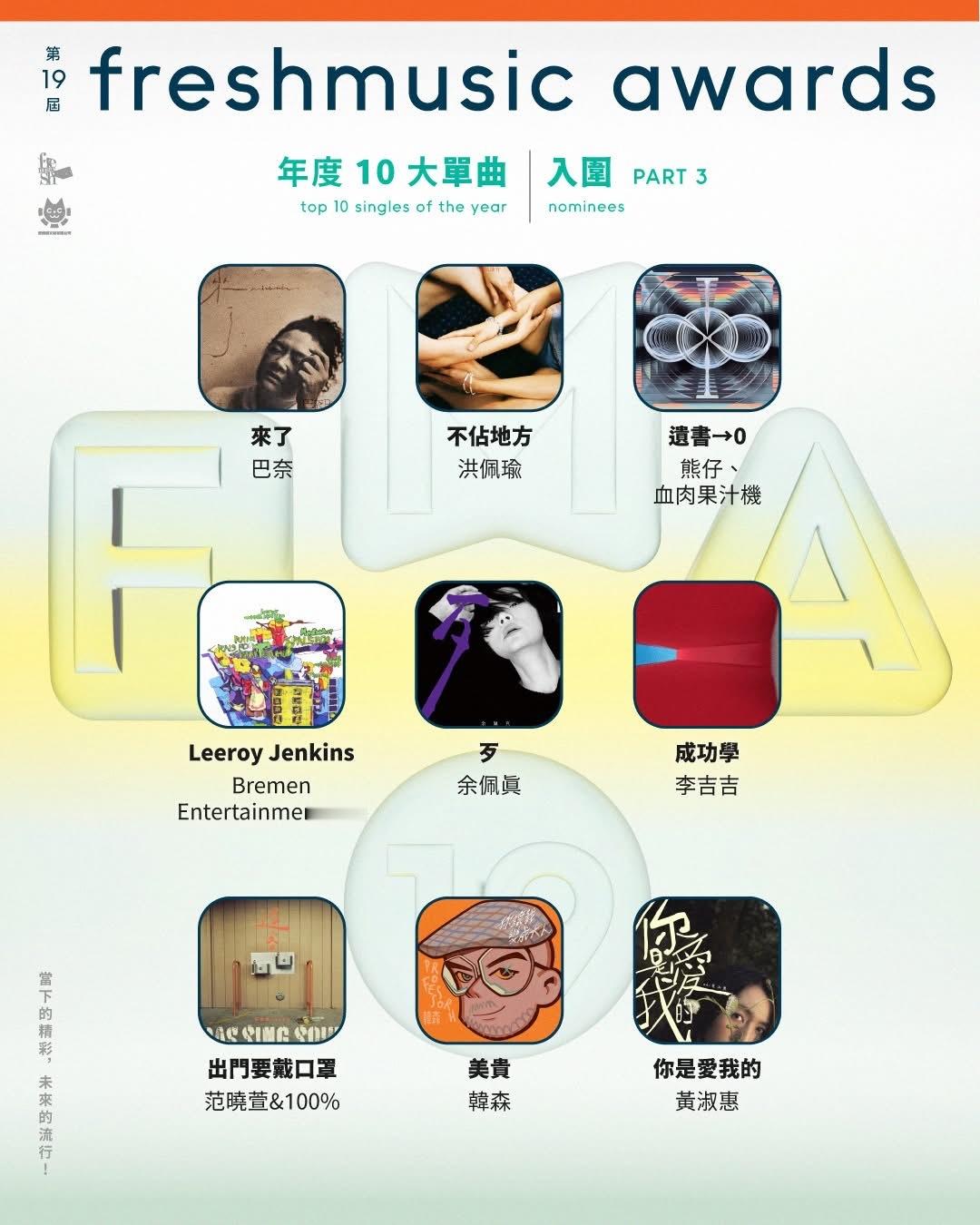 第19届Freshmusic Awards 公布年度10大单曲入围名单,从2万多首歌曲,选出最后的25强。