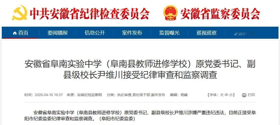 安徽省阜南实验中学(阜南县教师进修学校)原党委书记、副县级校长尹维川被查