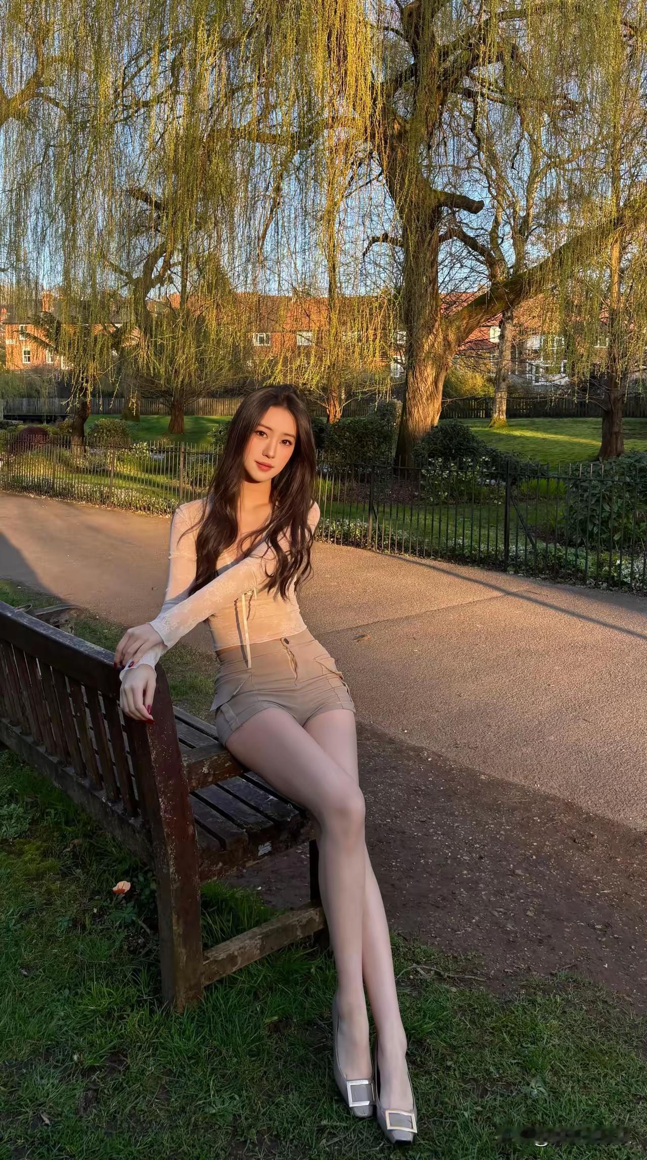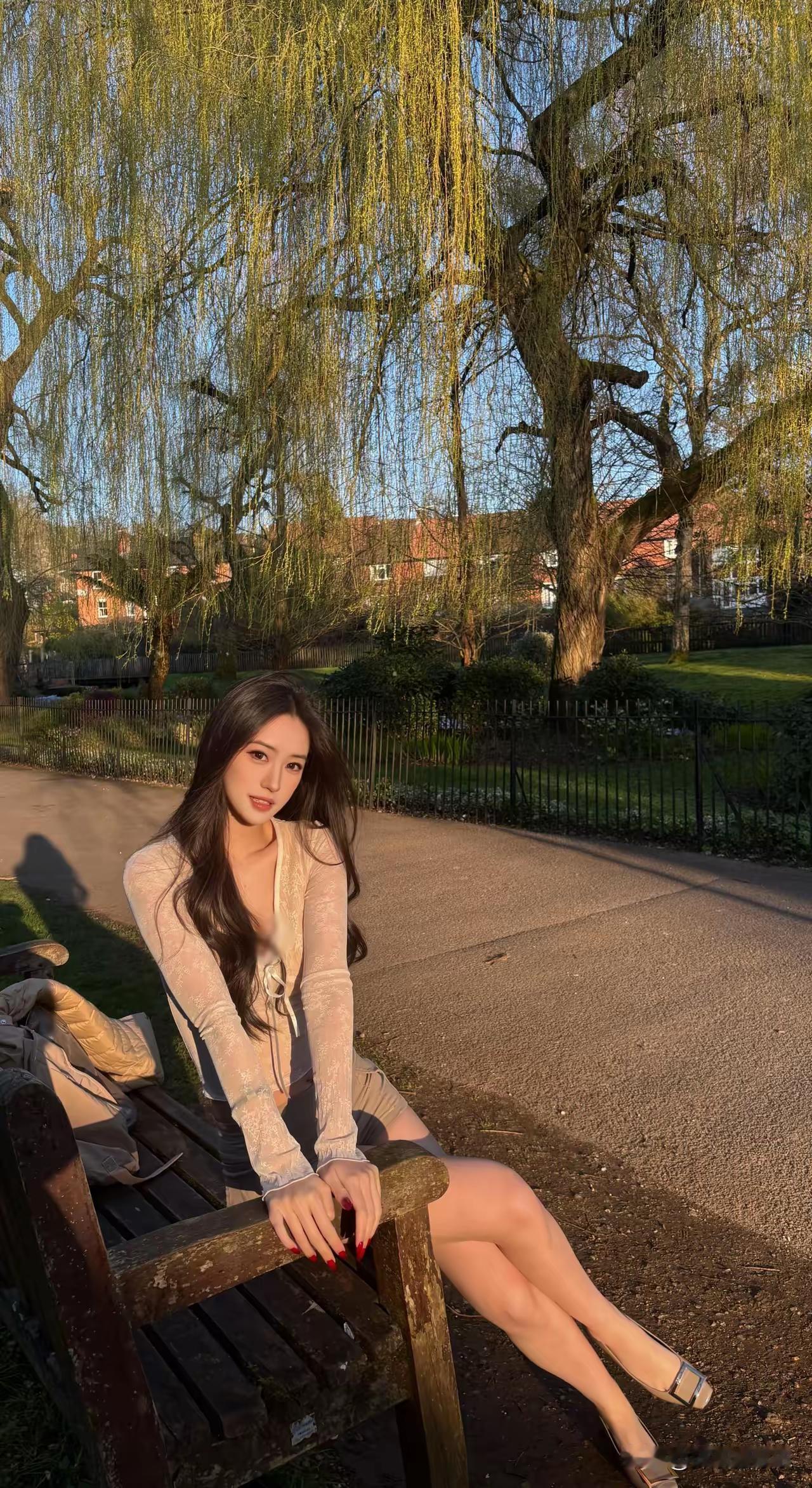 在绿意盎然的公园里,甜美少女轻轻托腮,宛如童话中的公主。🌿💕