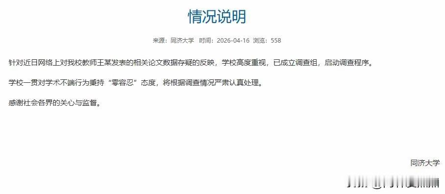 这就有点惊到老夫了[我想静静]居然连饶毅都下场点名了!这下估计不太好收场了!同济王院长被锤在顶级期刊造假,目前校方已成立调查组,力量博弈的时刻又到了! 手握国家杰青头衔,在《自然》连发两篇论文,却被扒出图片重复、数据造假。 早在去年就有人指出过问题,当时没掀起水花。这次饶毅在公众号公开质疑,直接把事闹大了。 同济大学紧急回应,成立调查组,对学术造假说“零容忍”。 拿国家项目、评职称靠的是造假的论文,这事可太伤科研的公信力了。 咱们就蹲一个调查结果,看看这顶刊论文到底是真是假。