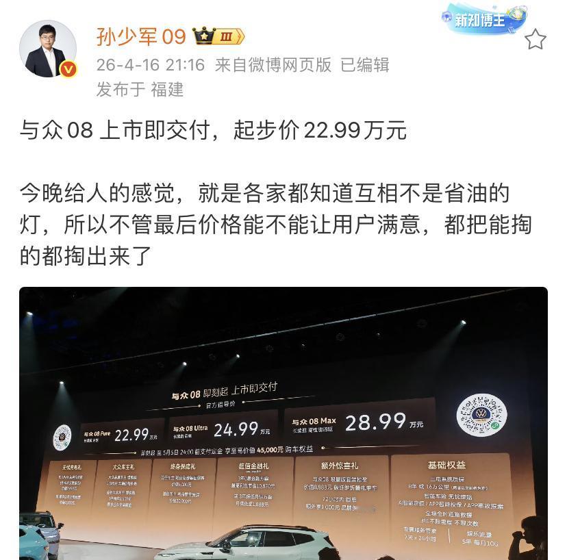 孙少军:与众08 上市即交付,起步价22.99万元! 今天晚上上市的非常多的车型,简直是应接不暇,也不知道为什么这么多车企都选择在今天上市。 与众08是大众安徽的最新代表作,大众安徽期望使用这款车能够拓展更多的销量,这个定的价格也比以前大众的定价要低。 各位是怎么看的?欢迎评论区留言。