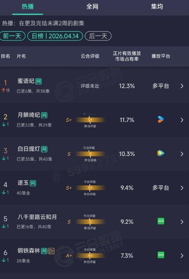《蜜语纪》云合登顶! 太离谱了!观众这是多么不爱看流量演员,钟汉良和朱珠的中年古偶《蜜语纪》云合登顶了,力压鞠婧祎陈都灵的《月鳞绮纪》,迪丽热巴陈飞宇的《白日提灯》,李昀锐黄杨钿甜《冰湖重生》,《蜜语纪》首播云合3.2%只是平开,第二日翻了四倍,占比12.3%,直接云合登顶,而且东方卫视上星首播收视率0.51%,比孙俪《危险关系》大结局0.44%的收视率都高,目前已经拉升到0.579%,已经超过《逐玉》,锁定东方卫视年冠的位置,哈哈,离大谱了,资本又押错宝,20年前观众喜欢看钟汉良谈恋爱,20年后还是喜欢看他谈恋爱,钟汉良还真是现偶的神!