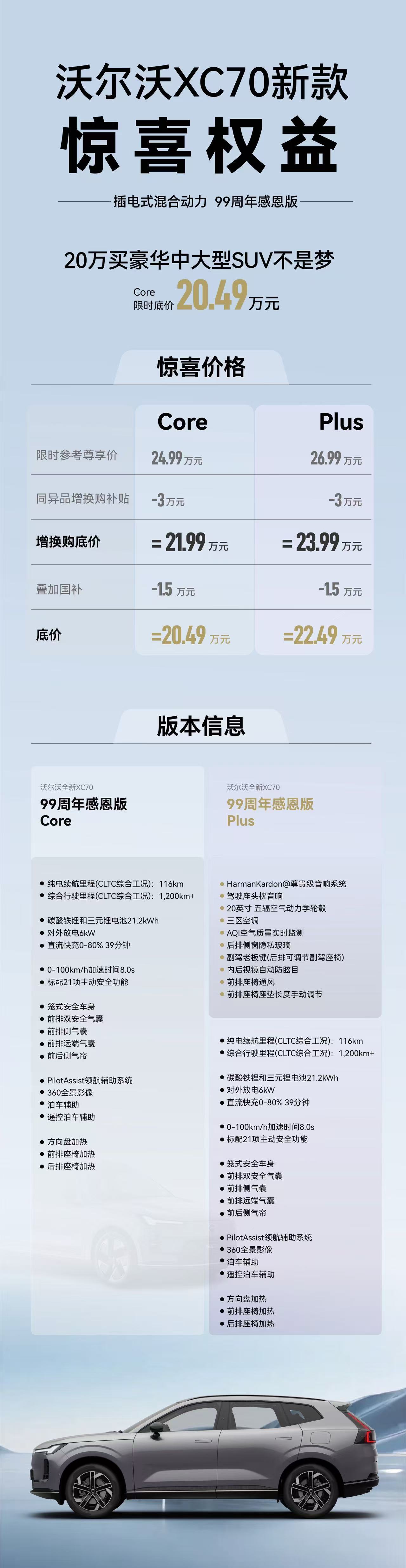 沃尔沃 99 周年的喜庆也落到了产品上,XC70 99 周年感恩版限时参考价 24.99 万,叠加本品 3 万置换/增购,再加最高 1.5 万国补,20 万出头就能开回家。