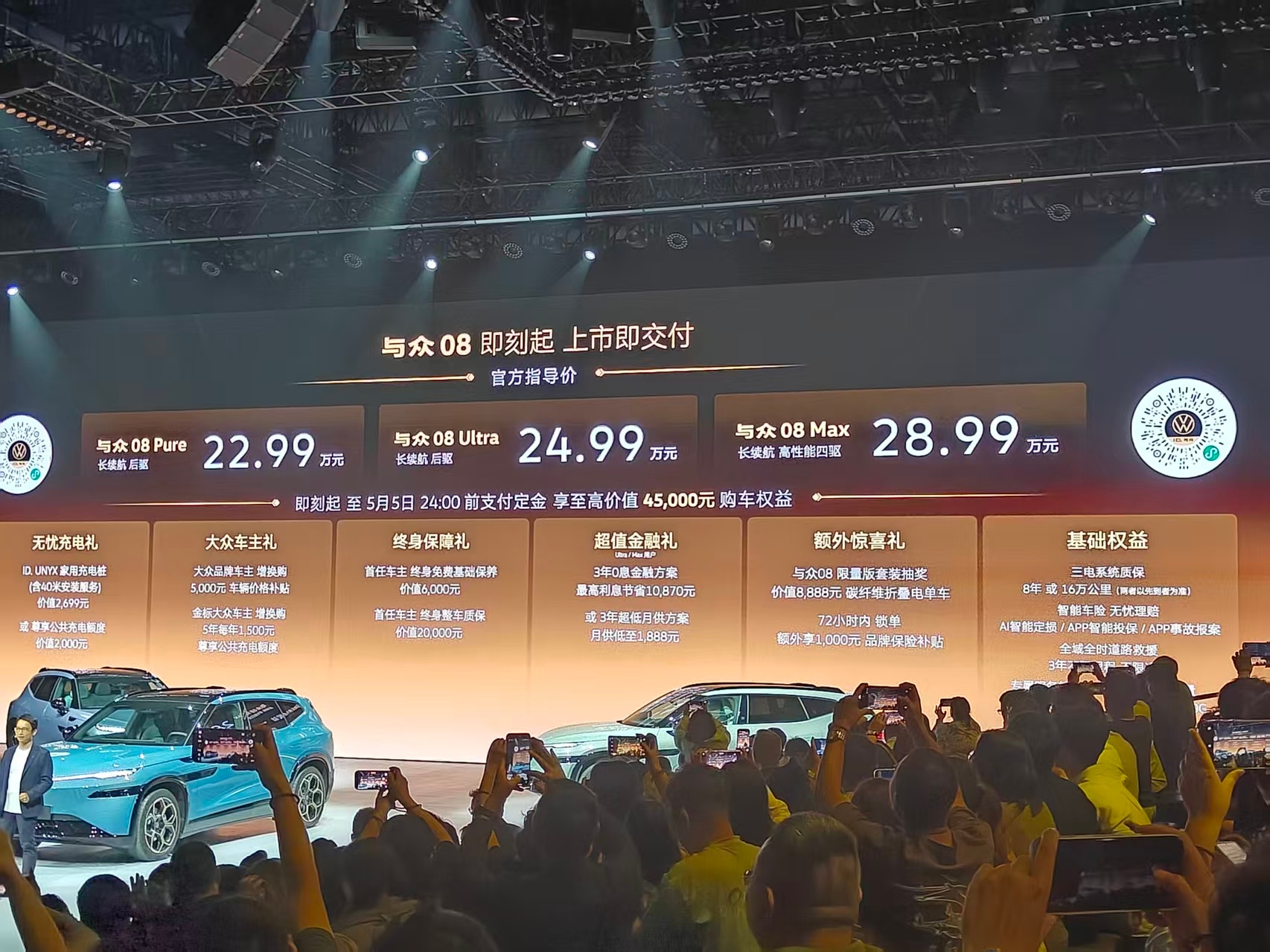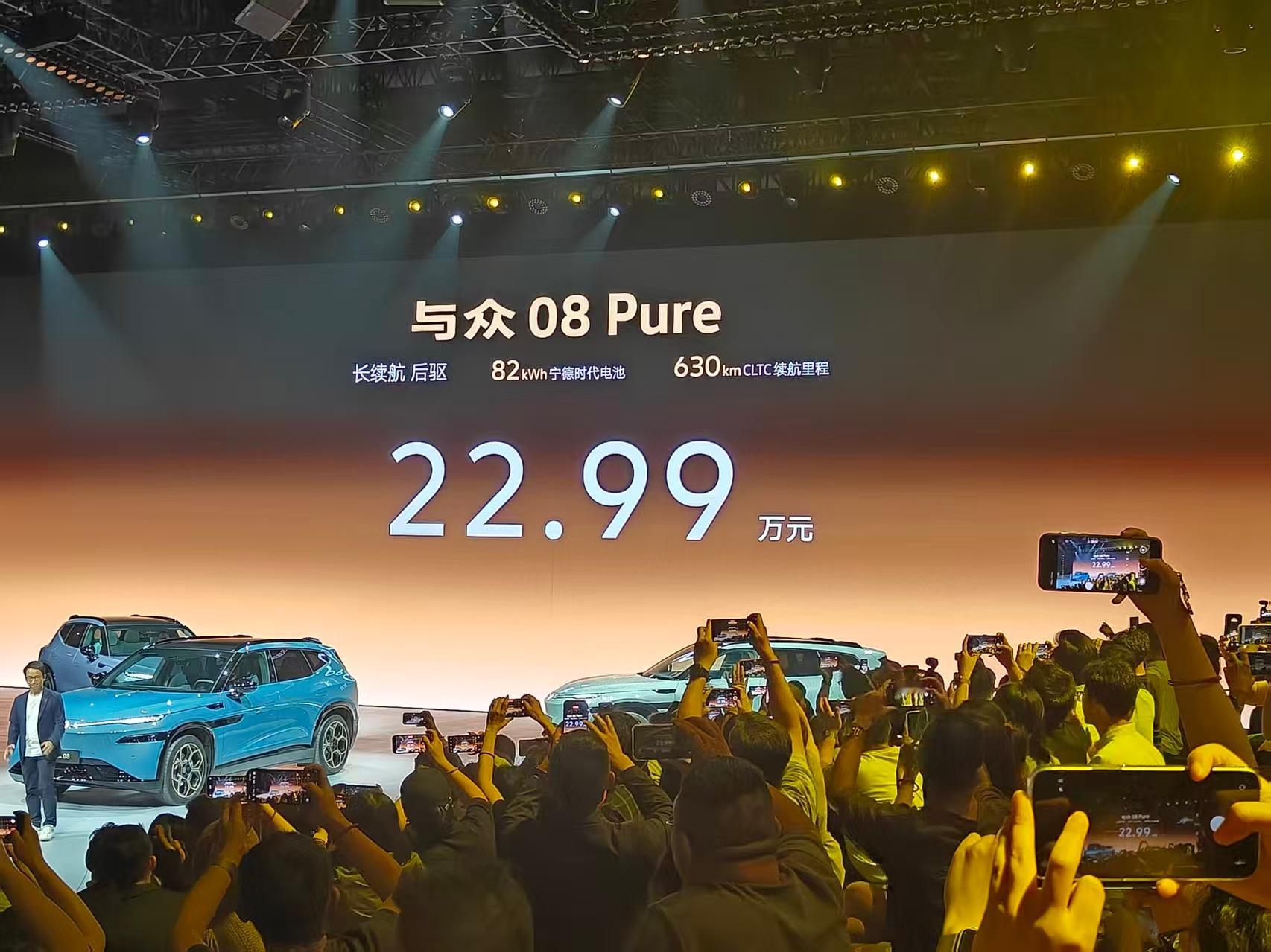 万众期待的官方售价终于公布啦:与众08 Pure 长续航后驱版:22.99万起与众08 Ultra 长续航后驱版:24.99万起与众08 Max 高性能四驱版:28.99万起